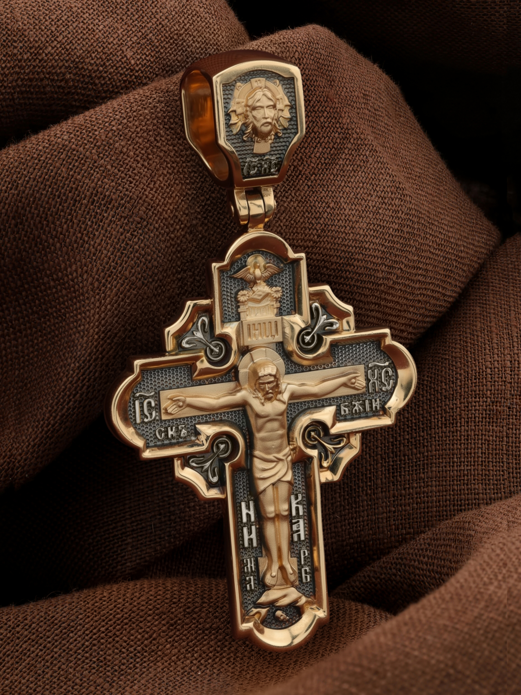 На лицевой стороне креста изображено Распятие Господа и Спасителя нашего Иисуса Христа, отдавшего Себя на смерть, чтобы другие могли жить — жить вечной жизнью, жить с Богом. Своею кровью Господь освятил крест и сделал его проводником Своей благодати, источником освящения верующих. На верхней табличке, выше головы Иисуса, расположена надпись, составленная Понтием Пилатом — «ИНЦИ». Она означает «Иисус Назорей, Царь Иудейский». Надпись «IС ХС» означает Иисус Христос помещается на разных сторонах поперечной (большой) перекладины креста. На кулонном кольце помещено изображение Духа Святого в виде голубя, сходящего с Небес