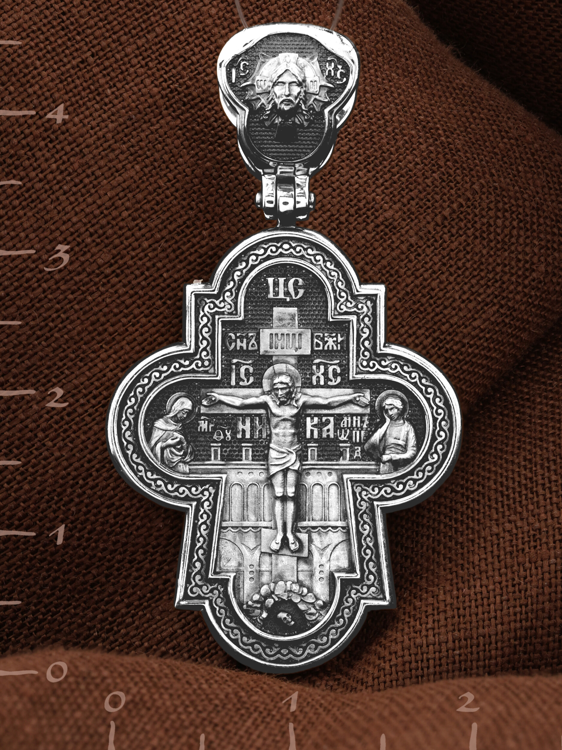 На лицевой стороне креста изображено Распятие Господа и Спасителя нашего Иисуса Христа, отдавшего Себя на смерть, для искупления грехов мира. Крест является символом жертвенной любви Всеблагого Бога к падшим людям, всепобеждающим духовным оружием христиан, основанием и средоточием церковной жизни. Господь сказал: кто хочет идти за Мною, отвергнись себя, и возьми крест свой, и следуй за Мною. (Мк. 8: 34). Над Распятием помещена надпись «Царь Славы». На верхней табличке, выше головы Иисуса, расположена надпись, составленная Понтием Пилатом — «IНЦI». Она означает «Иисус Назорей, Царь Иудейский». Надпись «IC» «ХC», означает Иисус Христос, помещается на разных сторонах поперечной перекладины креста. Возвышение, на котором стоит Крест, символизирует гору Голгофу, на которой произошло Распятие. Под подножием Креста изображена покоящаяся голова (череп) Адама. На кулонном кольце изображен Нерукотворный образ Господа и Спасителя нашего Иисуса Христа, чудесно отпечатавшийся на плате, которым Христос вытер свой лик.