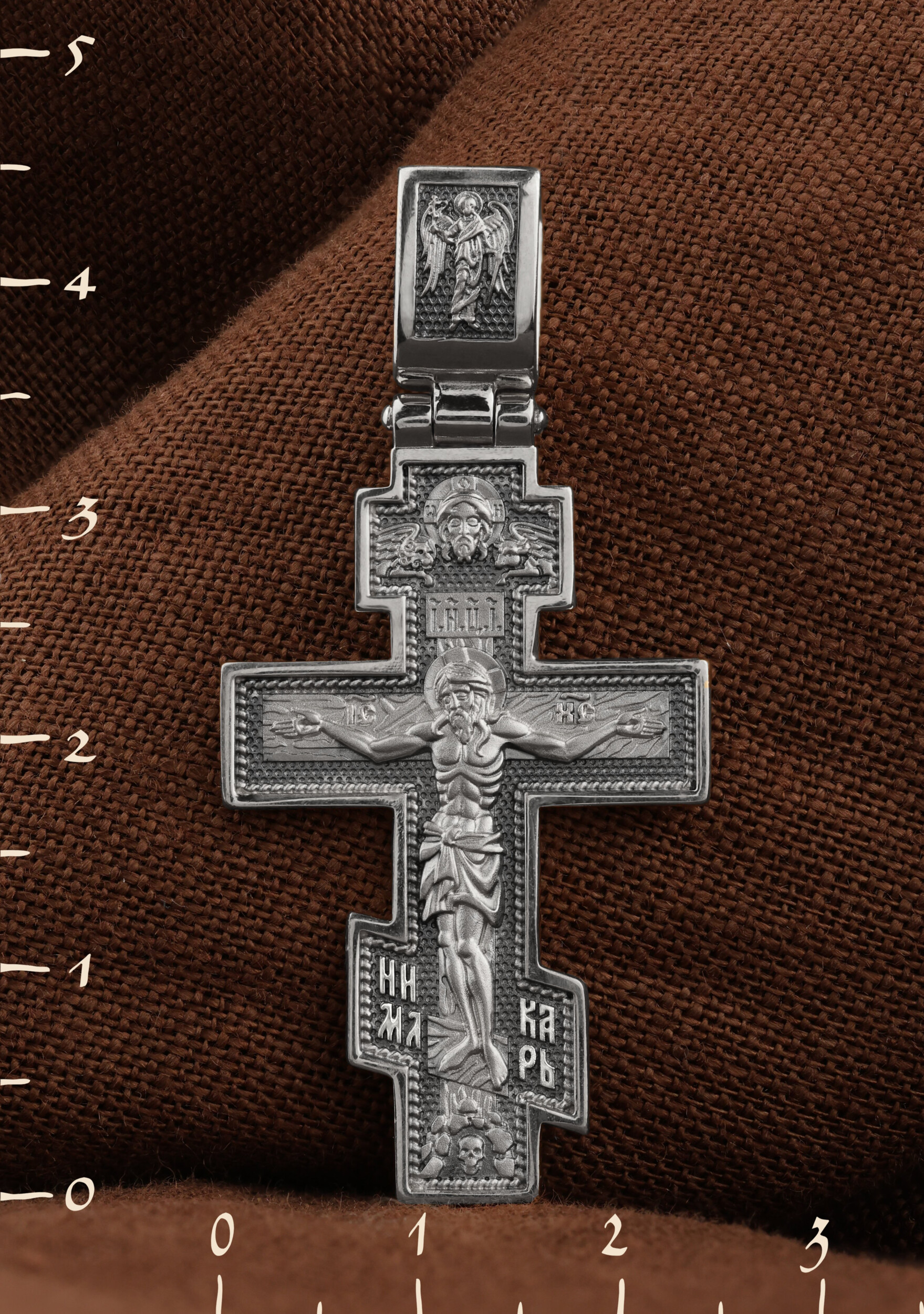 На лицевой стороне креста изображено Распятие, потому что это орудие казни Иисус Христос сделал орудием победы над грехом и смертью. Своими страданиями Он искупил грехи человечества, умерев и сошествовав во ад, победил сатану, освободил души праведников от вечной смерти и открыл им небесные врата рая. Жертва Христа сделала возможным спасение для каждого человека. На православном кресте Христос не умирает, а свободно простирает руки, ладони Иисуса открыты, будто он хочет обнять все человечество, даря им свою любовь и открывая путь к вечной жизни. Верхняя перекладина символизирует собой табличку с надписью «IHЦI» — Иисус Назарянин Царь Иудейский. У подножия добавляется: «НИКА» (греч. — Победитель) и «МЛРБ» — Место Лобное Рай Бысть. Возвышение, на котором стоит Крест, символизирует гору Голгофу, на которой произошло Распятие. У подножия Креста изображают прах Адама, обозначенный черепом.