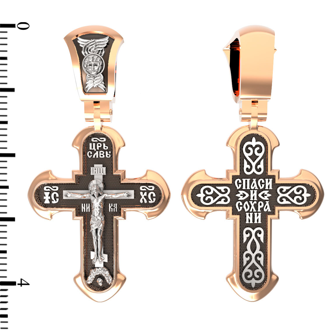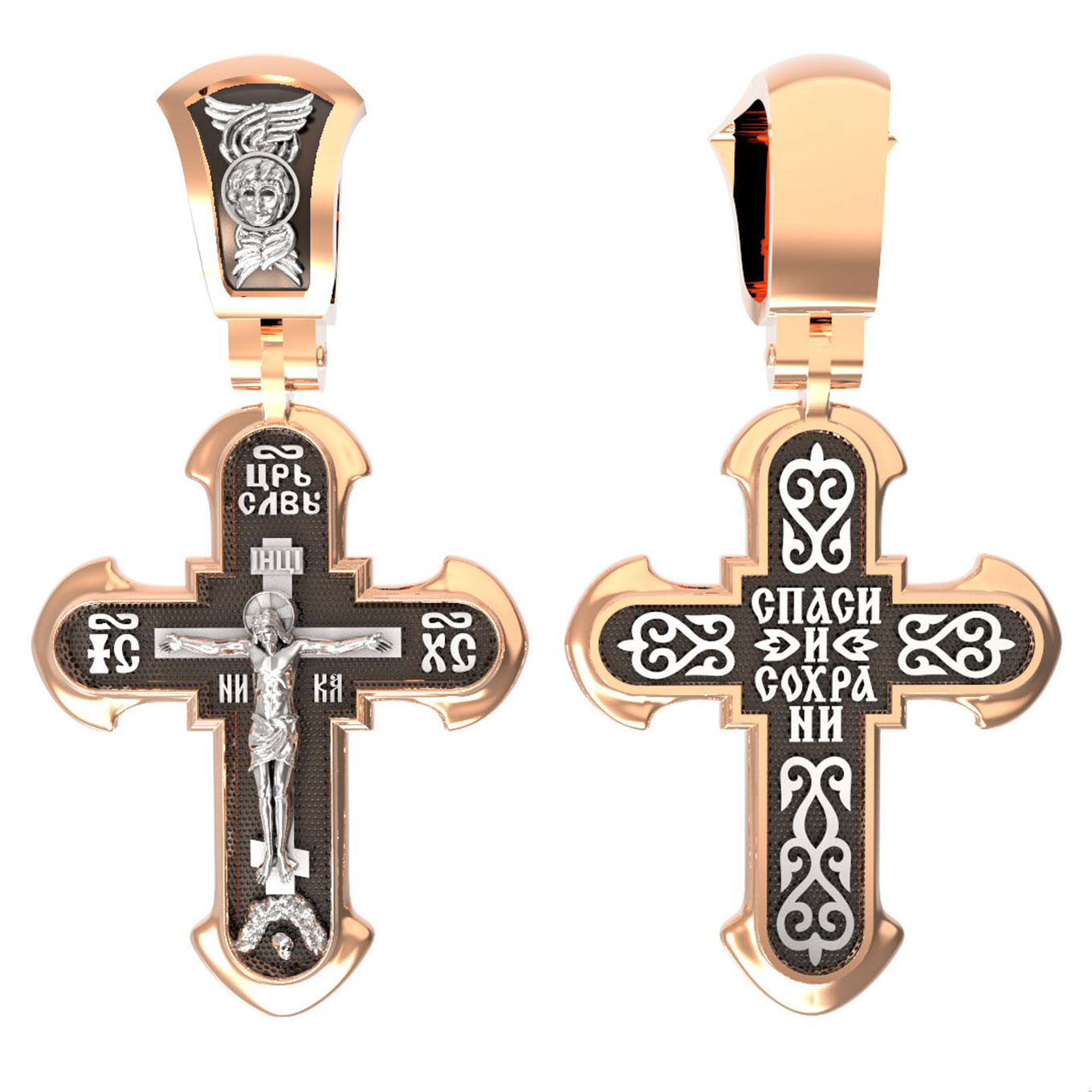 На лицевой стороне креста изображено Распятие Господа нашего Иисуса Христа. В традиции Православия — принято изображать Спасителя как Воскресшего Крестоносителя, призывающего в Свои объятия все концы мира. Его руки имеют горизонтальное положение, открытые ладони пробиты гвоздями, голова наклонена вправо, вокруг головы крестчатый нимб. Крест стоит на горе камней, символизирующих Голгофу, в основании которой различается череп. Это голова Адама. По преданию, тело Адама было погребено Симом, сыном Ноя, на месте, где впоследствии возникла гора Голгофа. Над головой Господа на поперечной перекладине аббревиатура «IНЦI», что символизирует табличку, которая была прибита к Кресту, с надписью «Иисус Назорей Царь Иудейский». Этим иудеи хотели посмеяться над Христом, не зная, что распинают истинного Царя всех царей. По бокам поперечной перекладины титлы святого имени Христа «IC» (Иисус) «ХС» (Христос), и слово «НИКА», что в переводе с греческого означает «победитель». Венчает лицевую сторону креста надпись «Царь Славы».