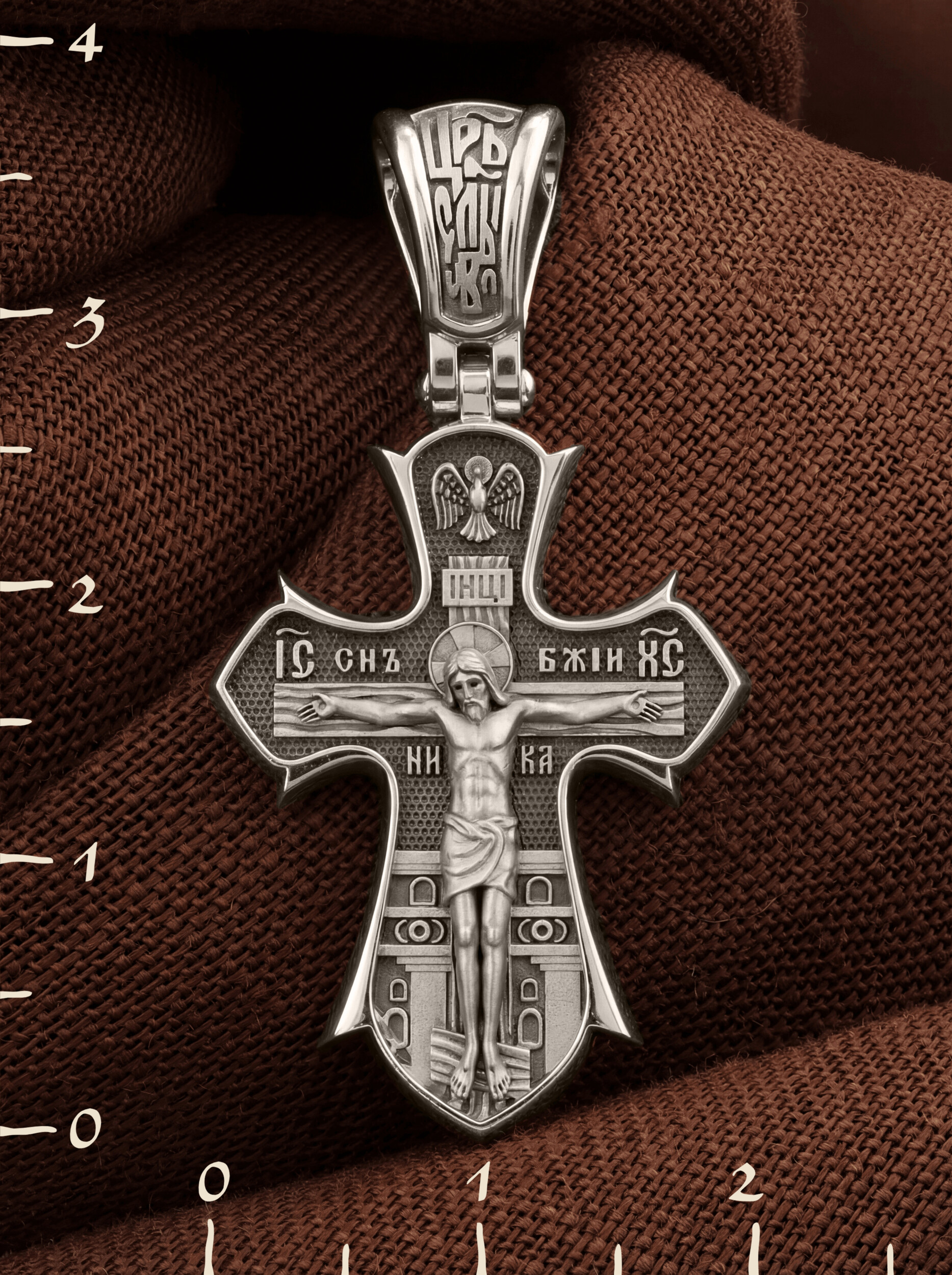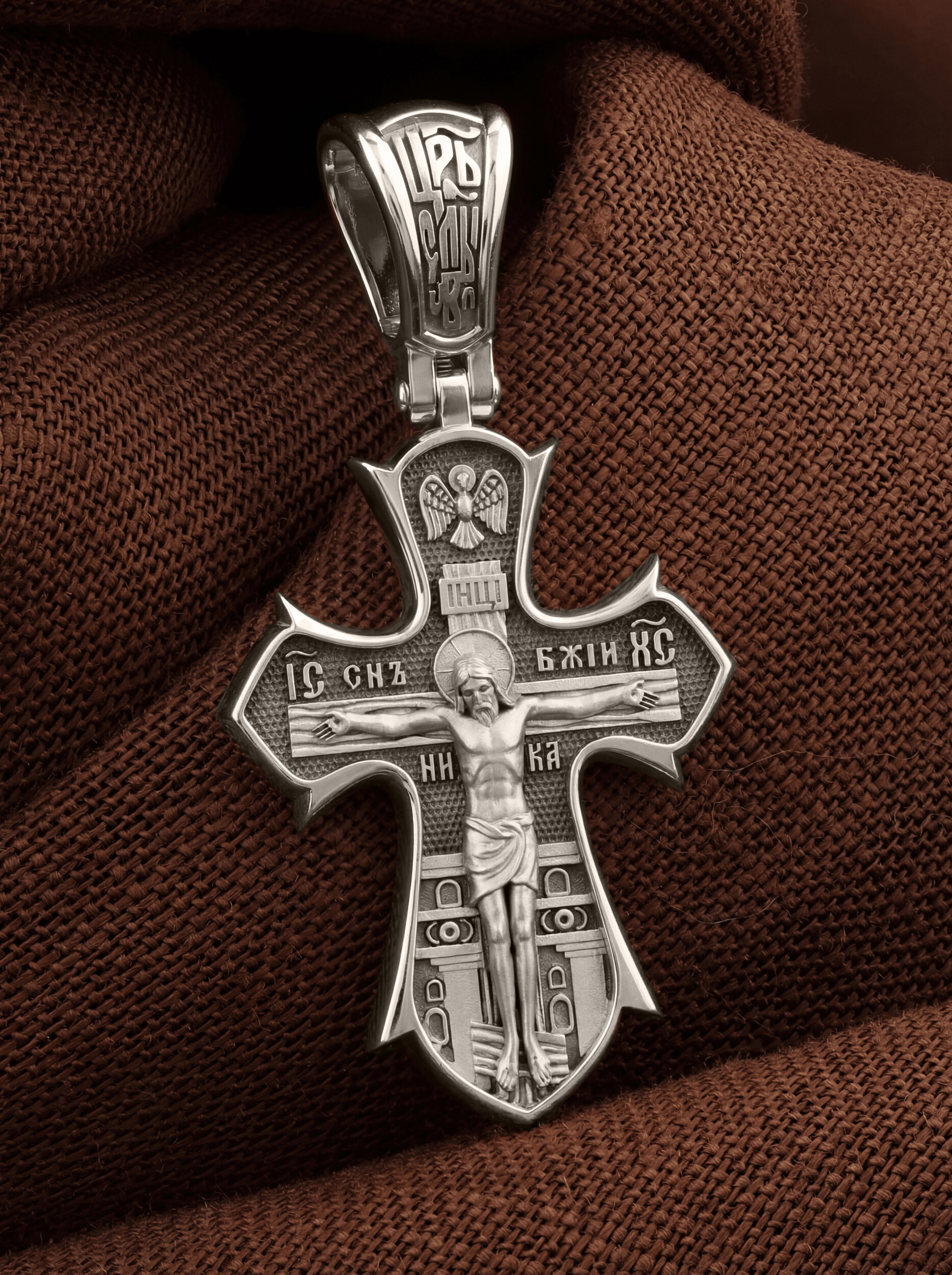 На лицевой стороне креста изображено распятие Господа нашего Иисуса Христа. Позади Распятия видна иерусалимская стена, знак того, что Господь был распят вне стен города. Но вместе с тем стена символизирует и Небесный Иерусалим, путь который открылся для человека через Голгофу. На кулоном кольце видим слова «ЦРЬ СЛВЫ» — Царь Славы. Верхняя перекладина символизирует собой табличку с надписью «IHЦI» — Иисус Назарянин Царь Иудейский. Над перекладиной пишется сокращенно имя Спасителя «IC XC» — Иисус Христос и словосочетание «СНЪ БЖIЙ» — «СЫН БОЖИЙ». Рядом с образом Христа помещены слова — «НИКА» (греч. — Победитель). Возвышение, на котором стоит Крест, символизирует гору Голгофу, на которой произошло Распятие. У подножия Креста изображают прах Адама, обозначенный черепом.