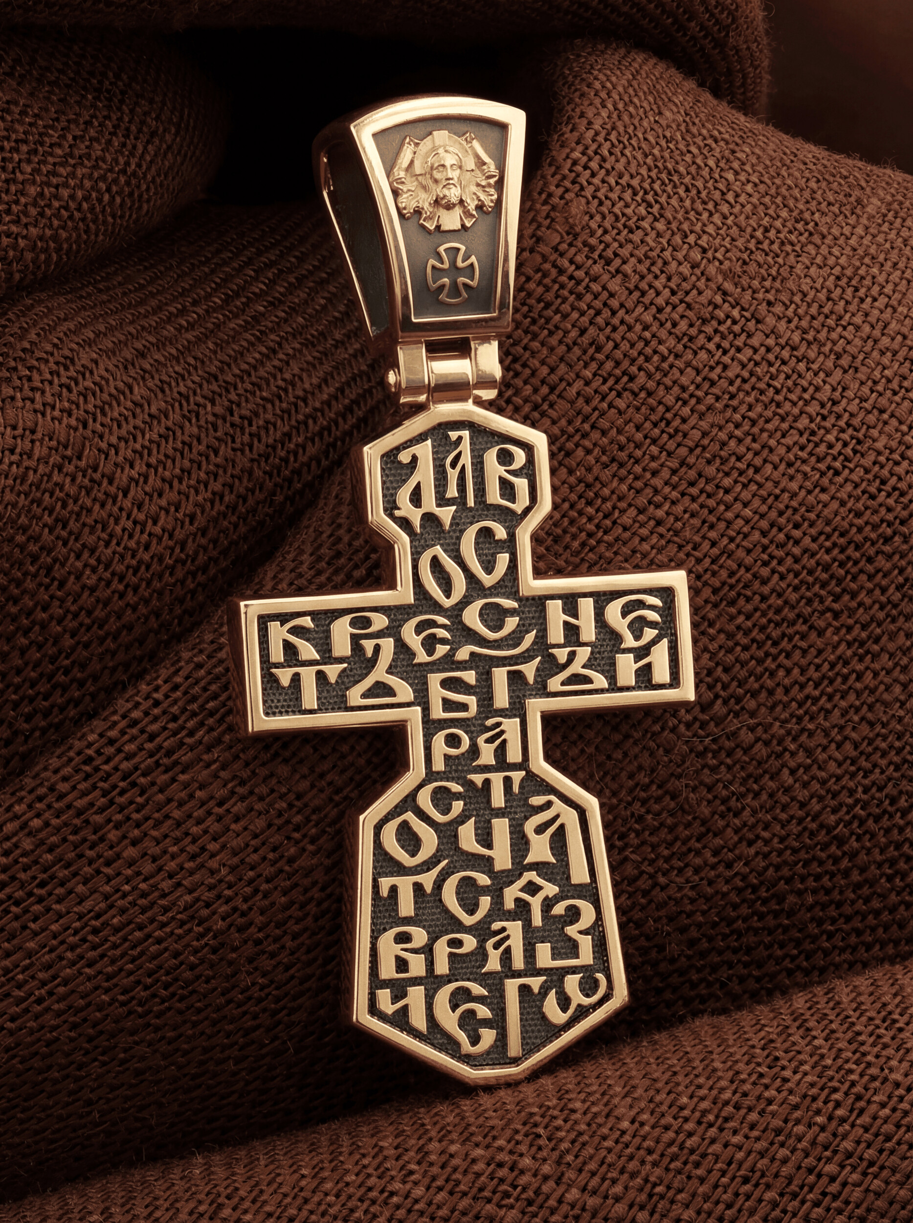 Всю оборотную часть креста занимает начальный стих оградительной молитвы Честному Кресту Господню: «Да воскреснет Бог, и расточатся врази Его».