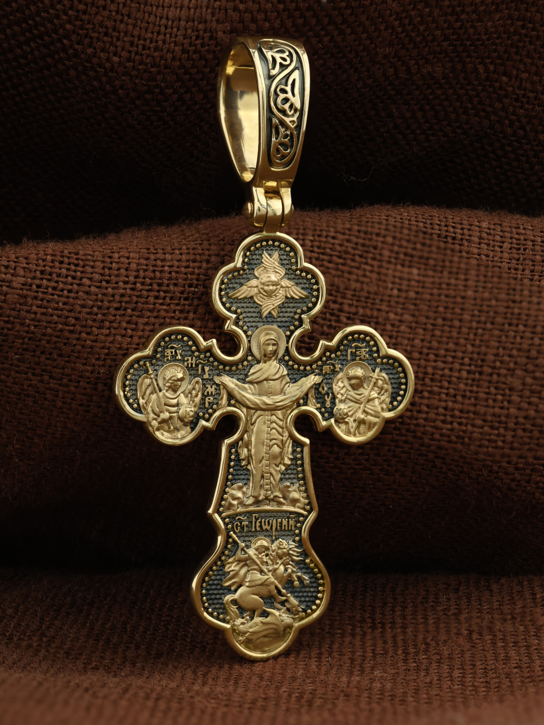 Центральную часть оборотной стороны креста украшает икона Божией Матери «Покров Пресвятой Богородицы». Праздник Покрова Пресвятой Богородицы пришел на Русь в XII веке из Византии и стал одним из самых почитаемых. Пресвятая Богородица простирает Свой молитвенный покров над всеми православными христианами и умоляет Сына своего о даровании вечного спасения каждому человеку. Над образом помещен шестикрылый Серафим. Справа помещено изображение Архангела Гавриила, слева- Архангела Михаила. На кресте внизу помещено изображение Святого Великомученика Георгия Победоносца — одного из самых почитаемых и удивительных святых. Он изображен как воитель, сидящий на вздыбленном коне и поражающий копьем огнедышащего змея. Змей символизирует собою сатанинские силы.