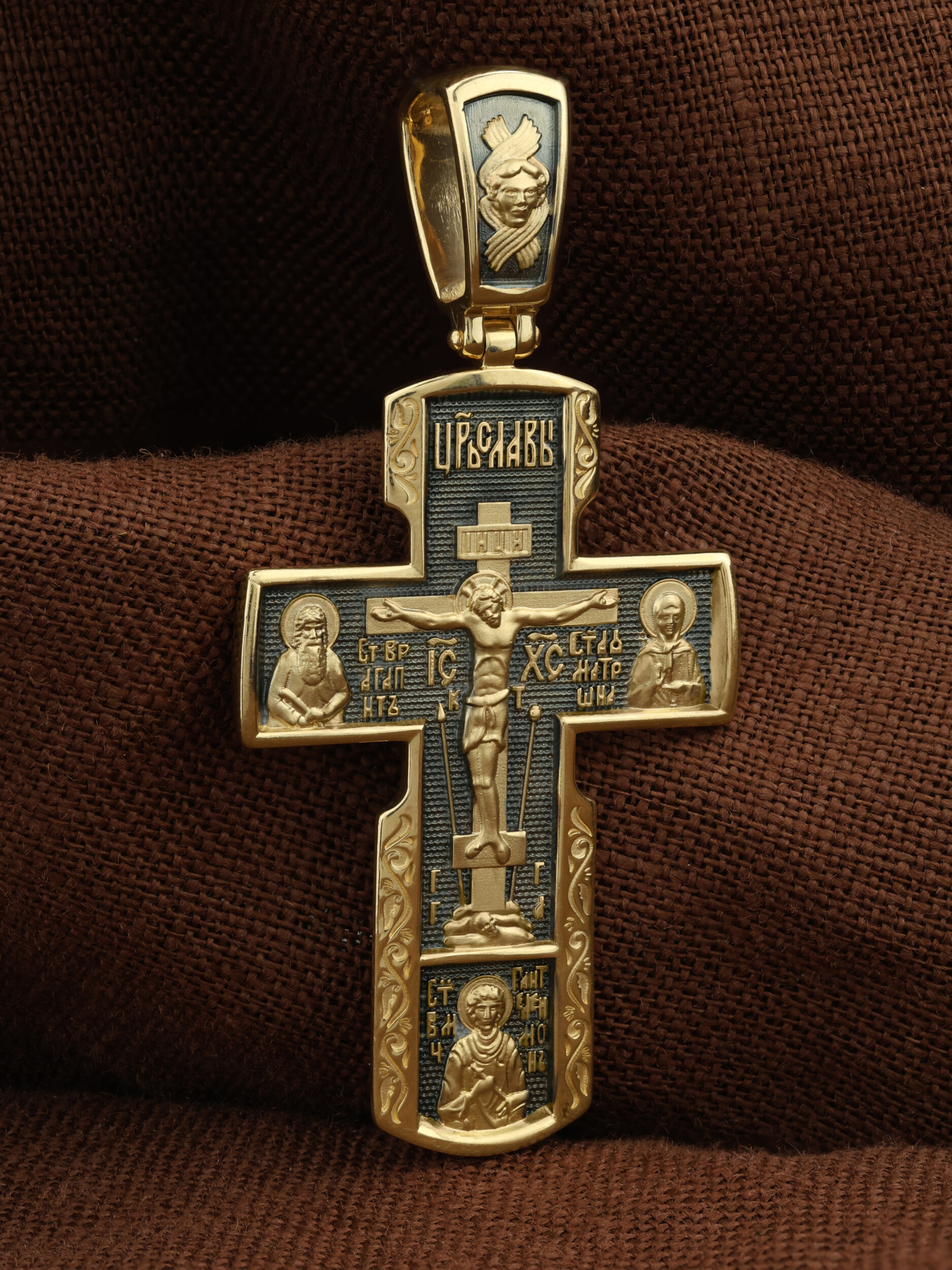 Как действенная помощь в немощах и болезнях был создан крест с образами святых целителей и со знаменитой афонской иконой Божией Матери «Всецарица». Над титлом видим слова «ЦРЬ СЛВЫ» — Царь Славы. Верхняя перекладина символизирует собой табличку с надписью «IHЦI» — Иисус Назарянин Царь Иудейский. Под перекладиной пишется сокращенно имя Спасителя «IC XC» — Иисус Христос. Возвышение, на котором стоит Крест, символизирует гору Голгофу, на которой произошло Распятие. У подножия Креста изображают прах Адама, обозначенный черепом. Справа от Распятия помещен образ прославленной святой блаженной Матроны. Слева — икона преподобный Агапита. Этот святой жил в пещерах Киево-Печерского монастыря в XI веке и бескорыстно врачевал мирян и монахов. У основания Креста Господня изображен великомученик Пантелеимон Целитель. Господь даровал удивительную силу его молитве. Ею он исцелял любые болезни и даже воскрешал умерших.