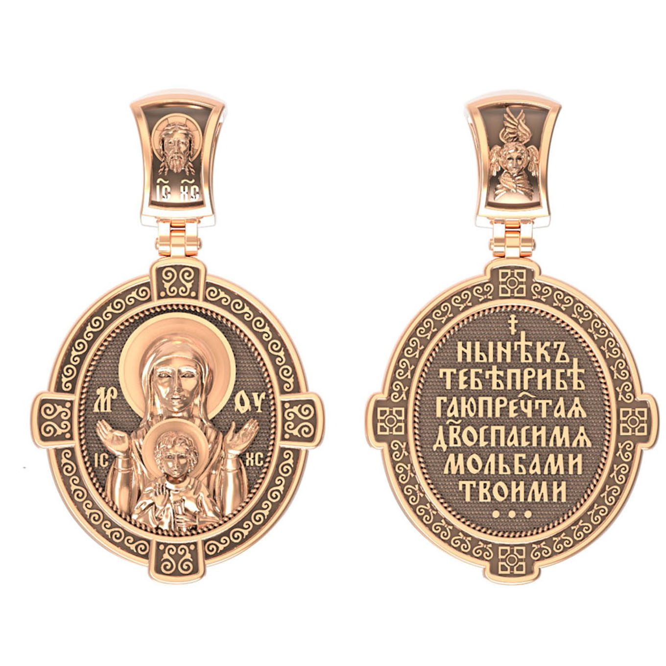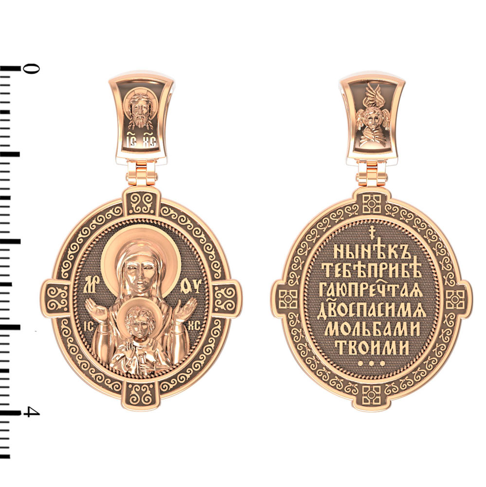 На кулонном кольце изображен Спас Нерукотворный — Символ вочеловечившегося Божества и шестикрылый Серафим — самый приближенный к Господу Ангел.