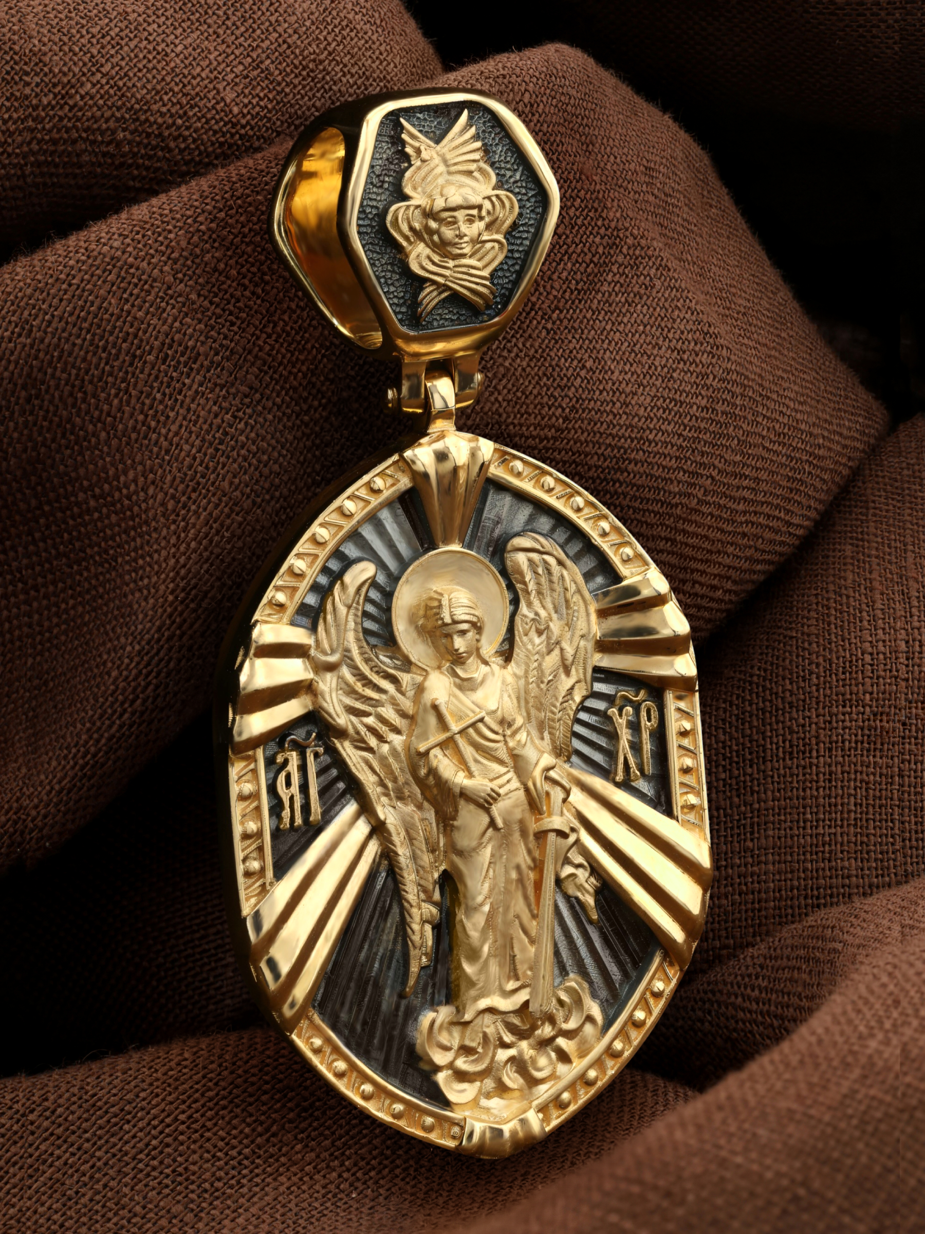 На оборотной стороне креста изображена прямостоящая фигура Ангела Хранителя с традиционными атрибутами в руках: крестом, которым он осеняет человека, и мечом для прогнания бесов. По Православному учению, каждому, принявшему святое крещение, дается Господом Ангел Хранитель, который сопровождает человека всю его жизнь, помогая в добрых делах и охраняя от нападок злых духов. Святые отцы утверждают, что только верующий человек имеет рядом с собой Ангела Хранителя: «Тем, которые сподобились крещения и возносятся на высоту добродетелей, даны от Бога Ангелы, заботящиеся о них и содействующие им. В этом уверяет нас Господь, когда говорит, что есть Ангелы Хранители у всякого, кто верует в Него» (преп. Анастасий Синаит). Но Ангел Хранитель пребывает с христианином, если только мы не прогоним его греховными делами, поскольку «как дым разгоняет пчел, так и грех прогоняет от нас Ангела Хранителя» (свт. Василий Великий). Но и после завершения земного пути Ангел Хранитель не покидает христианина, а помогает душе преодолеть воздушные мытарства на пути в Царство Небесное.
