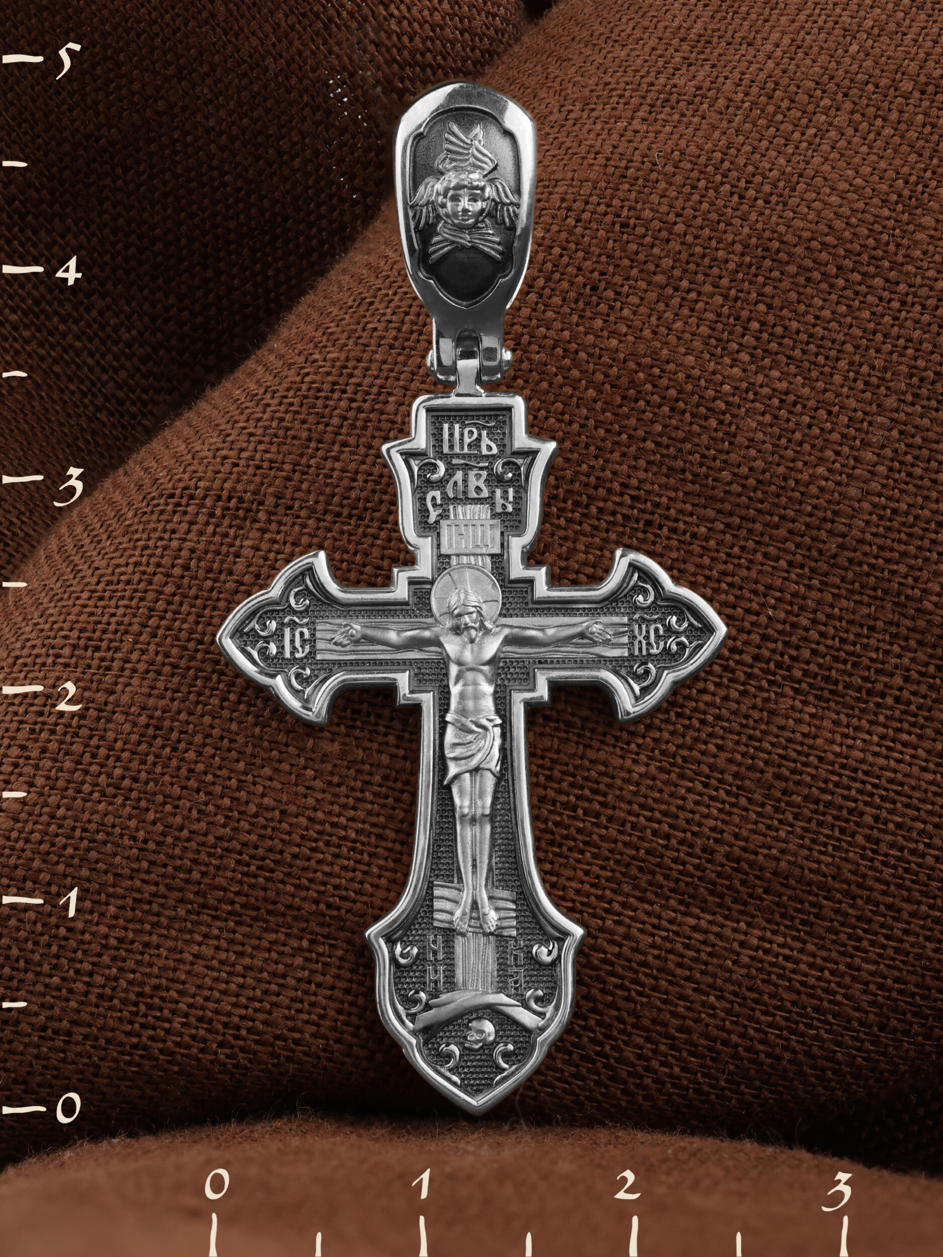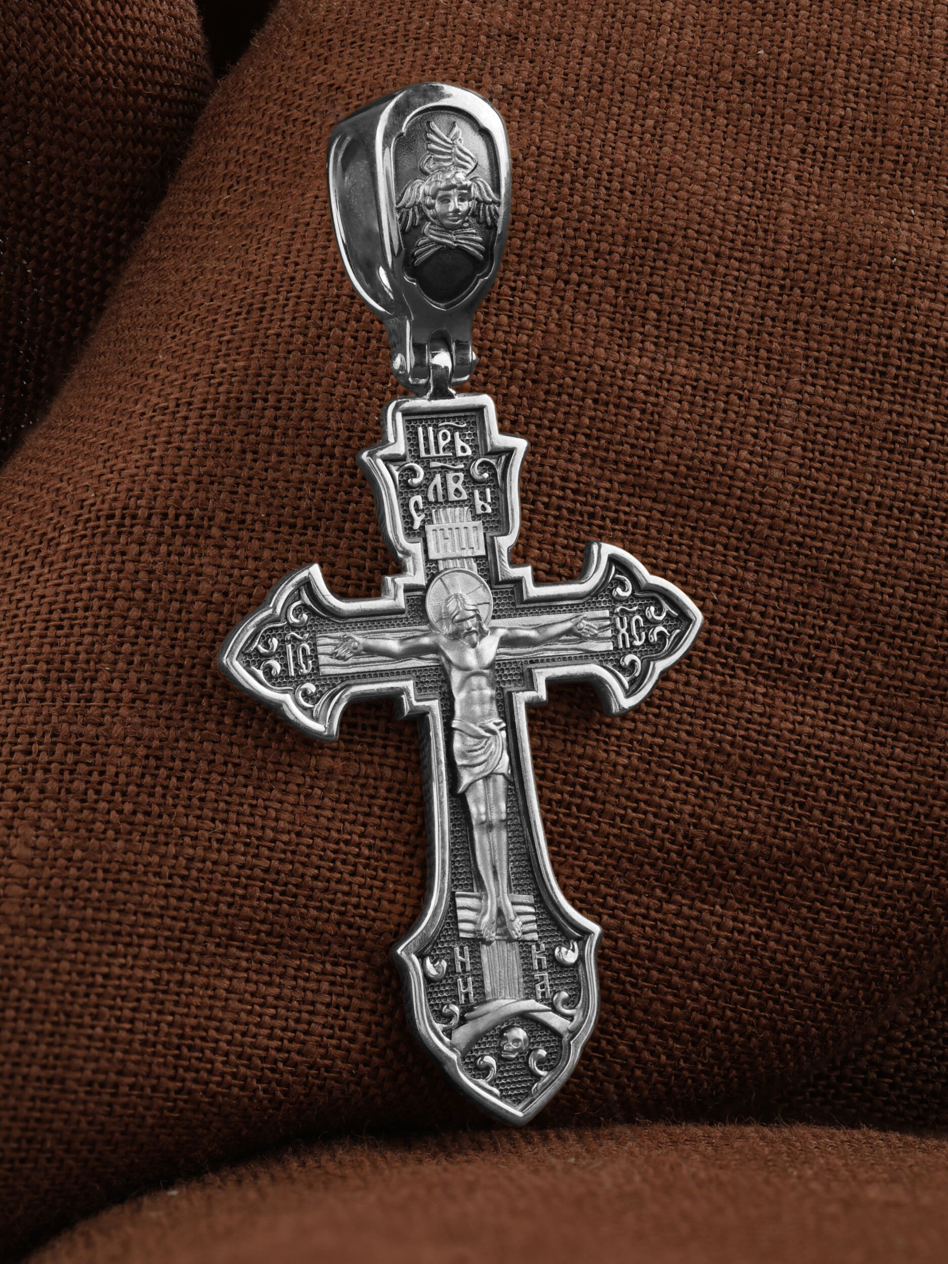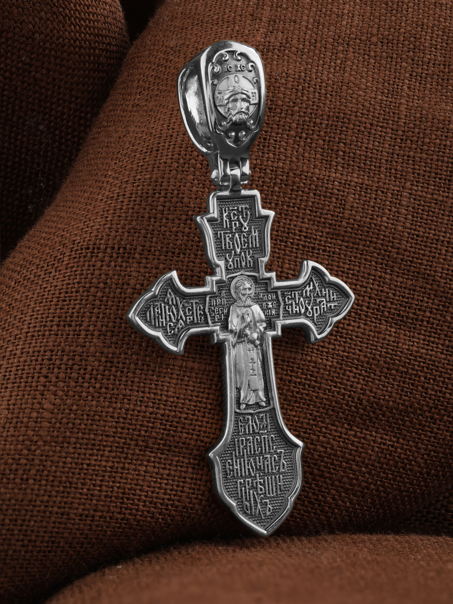 На лицевой стороне этого креста центральную часть занимает икона Распятия Христа — образ жертвы, принесенной Господом за грехи людей. Именно ко Христу, сошедшему на землю ради нашего спасения, возносятся все молитвы. Рядом с Его образом помещены слова — «НИКА» и «Царь Славы». Эти слова характеризуют Господа как Великого Архиерея, победителя смерти. Также Распятие сопровождается надписями, олицетворяющими Христа — это святое имя Христа «IC» (Иисус) «ХС» (Христос). Венчает лицевую сторону креста надпись «Царь Славы». На кулонном кольце помещено изображение Спаса Нерукотворного.
