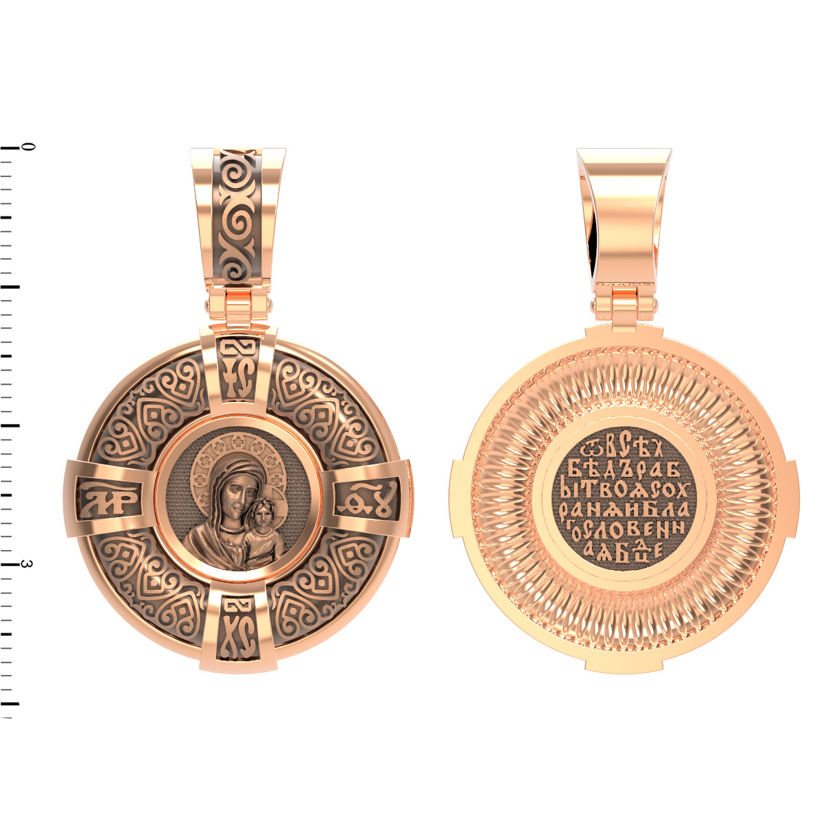 На лицевой части образка изображена Казанская икона Пресвятой Богородицы — одна из самых почитаемых в России чудотворных икон Богородицы. Богословское значение Казанской иконы — указать верующим истинный Путь к спасению, который лежит через Христа. Только Божия Матерь имеет настолько сильное дерзновение к Спасителю, что может ходатайствовать перед Ним за всех верных. Именно этот образ дарится новой повенчанной паре, как хранитель очага и семейная реликвия. Молитва перед Казанской иконой Божьей Матери помогает во всех сложных случаях жизни, в болезнях, во всех печалях, невзгодах, скорбях. Уникальная история появления, чудеса, случившиеся по молитвам православных людей возле образа — все это делает Казанскую Богородицу особенной, среди тысяч других икон.
