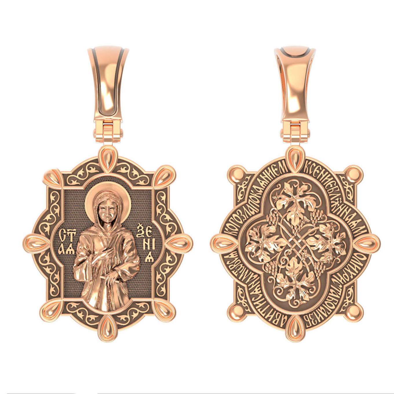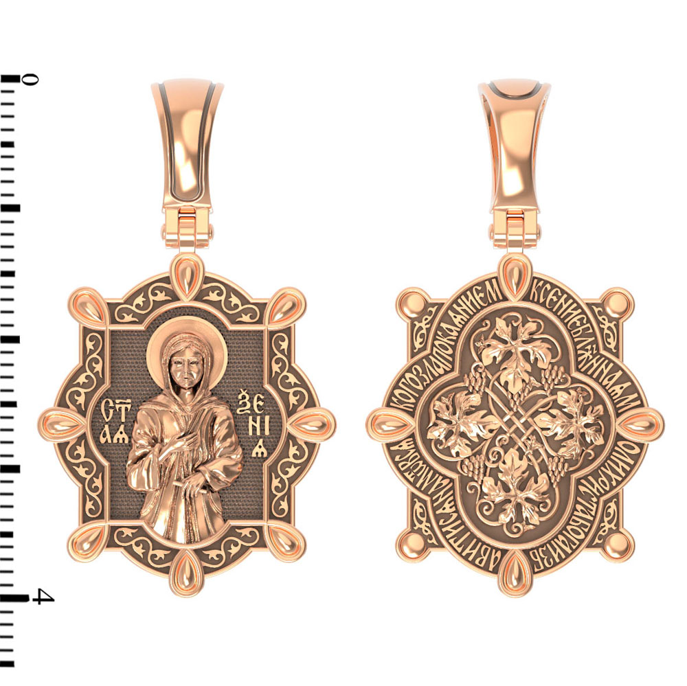 На оборотной стороне изображена виноградная лоза — символы церкви и евхаристии. «Я есмь лоза, — говорил Иисус Христос Своим ученикам, — а вы ветви; кто пребывает во Мне, и Я в нем, тот приносит много плода» (Ин. 15, 5), «Я есмь истинная виноградная лоза, а Отец Мой — виноградарь». Вокруг образка написана молитва: «Ксение блаженная, моли Христа Бога избавитися нам от всякаго зла покаянием».