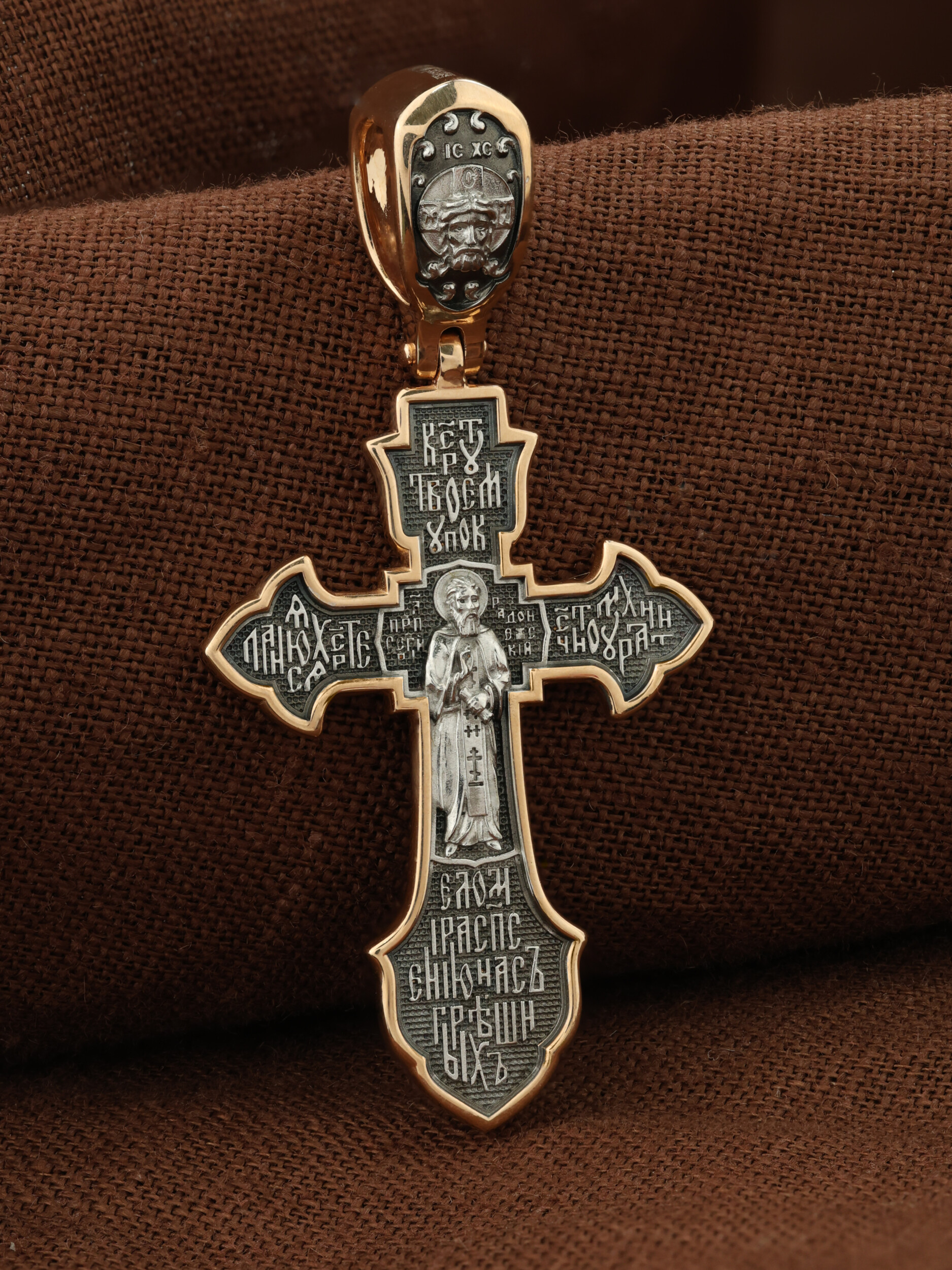 На лицевой стороне этого креста центральную часть занимает икона Распятия Христа — образ жертвы, принесенной Господом за грехи людей. Именно ко Христу, сошедшему на землю ради нашего спасения, возносятся все молитвы. Рядом с Его образом помещены слова — «НИКА» и «Царь Славы». Эти слова характеризуют Господа как Великого Архиерея, победителя смерти. Также Распятие сопровождается надписями, олицетворяющими Христа — это святое имя Христа «IC» (Иисус) «ХС» (Христос). Венчает лицевую сторону креста надпись «Царь Славы». На кулонном кольце помещено изображение Спаса Нерукотворного.