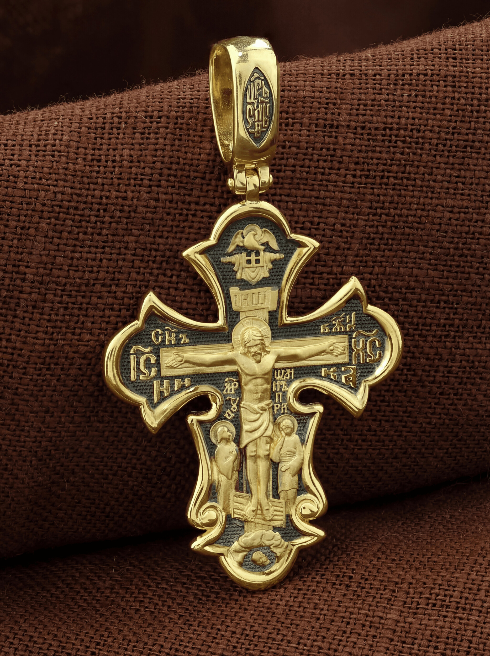 На лицевой стороне креста изображено Распятие Господа и Спасителя нашего Иисуса Христа, отдавшего Себя на смерть, для искупления грехов мира. Крест является символом жертвенной любви всеблагого Бога к падшим людям, всепобеждающим духовным оружием христиан, основанием и средоточием церковной жизни. Верхняя перекладина символизирует титло — табличку, на которой, согласно Евангелию, было начертано: Иисус Назорей Царь Иудейский (IНЦI). Также Распятие сопровождается надписями, олицетворяющими Христа. Надпись «IС» « ХС», что означает Иисус Христос, слово «НИКА», что означает «победитель» и слова «Сын Божий» помещается на разных сторонах поперечной перекладины креста. Над вершиной Распятия помещено изображение Святого Духа в виде голубя. Слева от Распятия изображена Пресвятая Богородица, справа — апостол и евангелист Иоанн Богослов, один из ближайших учеников Иисуса Христа. Возвышение, на котором стоит Крест, символизирует гору Голгофу, на которой произошло Распятие. Под подножием Креста изображена покоящаяся голова (череп) Адама. На кулонном кольце помещена надпись «Царь Славы».