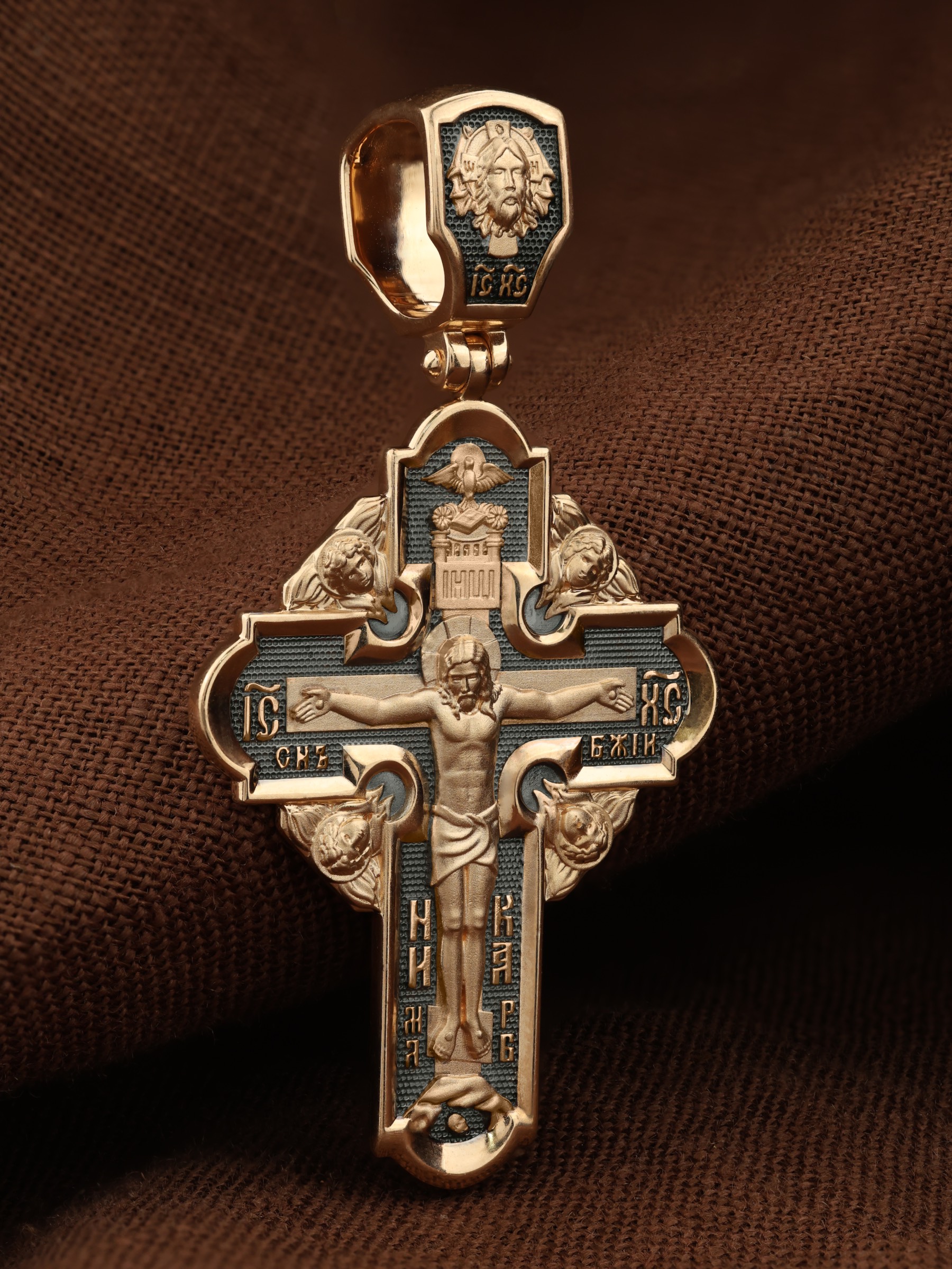 На лицевой стороне креста изображено Распятие Господа и Спасителя нашего Иисуса Христа. Крест- символ спасения и искупления рода человеческого, знамение победы над смертью и адом. Верхняя перекладина символизирует титло — табличку, на которой, согласно Евангелию, было начертано: Иисус Назорей Царь Иудейский (IНЦI). Надпись «IC» «ХC», означает Иисус Христос, помещается на разных сторонах поперечной перекладины креста. Ниже перекладины расположено словосочетание «СЫН БОЖИЙ», что означает божественную природу Иисуса Христа. Надпись «МЛРБ» — «место лобное рай бысть» означает, что место лобное стало раем и помещаются в нижней части креста. Рядом — слово «НИКА», что означает «победитель». Возвышение, на котором стоит Крест, символизирует гору Голгофу, на которой произошло Распятие. Под подножием Креста изображена покоящаяся голова (череп) Адама. На кулонном кольце изображен Нерукотворный образ Господа и Спасителя нашего Иисуса Христа, чудесно отпечатавшийся на плате, которым Христос вытер свой лик.