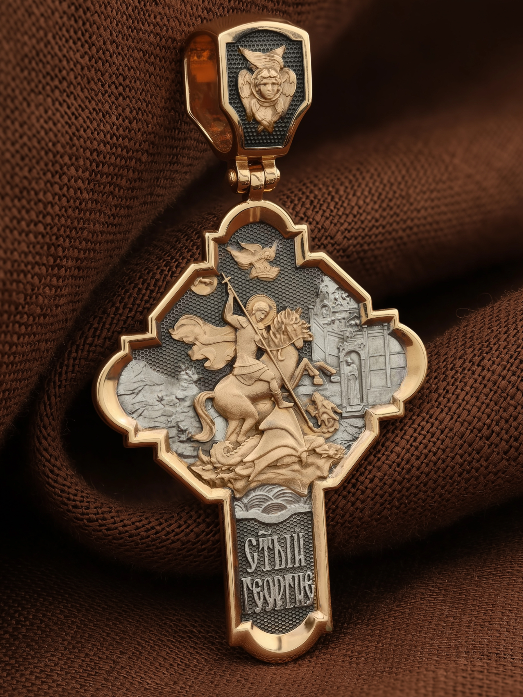 На оборотной стороне креста помещено изображение Святого Великомученика Георгия Победоносца — одного из самых почитаемых и удивительных святых. Георгий родился в Каппадокии (Малая Азия) в семье богатых и знатных горожан. Юношей поступил на службу к римскому императору Диоклетиану, за отличное знание военного дела и проявленную в боях и походах храбрость был приближен к императору и удостоен высокого воинского звания. Во время начавшихся гонений на христиан, перешел на сторону гонимых и, отвергнув человеческий страх, стал ярым проповедником учения Христа. Мучители подвергли опального воеводу жесточайшим восьмидневным пыткам и казнили его (обезглавили) в возрасте около тридцати лет в 303 году. Георгий изображен как воитель, сидящий на вздыбленном коне и поражающий копьем огнедышащего змея. Слева над образом изображена благословляющая Божия десница. Над святым изображен ангел возлагающий на него венец мученика. Змей символизирует собою сатанинские силы. Молитвами вознесенными к Всевышнему и своей непреклонной верой он смог одолеть чудовище. Святой убил змея, спас царскую дочь, принесенную в жертву, и жителей города, их души от влияния дьявола, породив в них надежду и веру в Господа, призывая людей принять христианскую веру. На кулонном кольце изображен шестикрылый Ангел — Серафим.