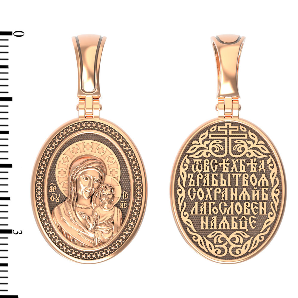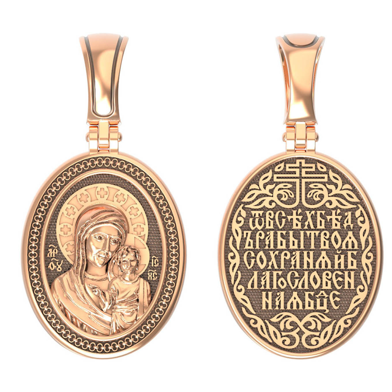 На лицевой части образка изображена Казанская икона Божией Матери — одна из самых почитаемых в России чудотворных икон Богородицы. Богословское значение Казанской иконы — указать верующим истинный Путь к спасению, который лежит через Христа. Только Божия Матерь имеет настолько сильное дерзновение к Спасителю, что может ходатайствовать перед Ним за всех верных. Именно этот образ дарится новой повенчанной паре, как хранитель очага и семейная реликвия. Молитва перед Казанской иконой Божьей Матери помогает во всех сложных случаях жизни, в болезнях, во всех печалях, невзгодах, скорбях. Уникальная история появления, чудеса, случившиеся по молитвам православных людей возле образа — все это делает Казанскую Богородицу особенной, среди тысяч других икон.