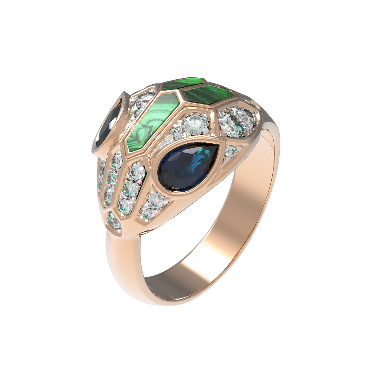 Кольцо из золота c бриллиантами, сапфиром и малахитом