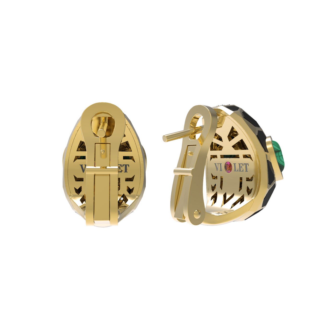 Серьги из лимонного золота c бриллиантами, рубином, ониксом, малахитом и перламутром