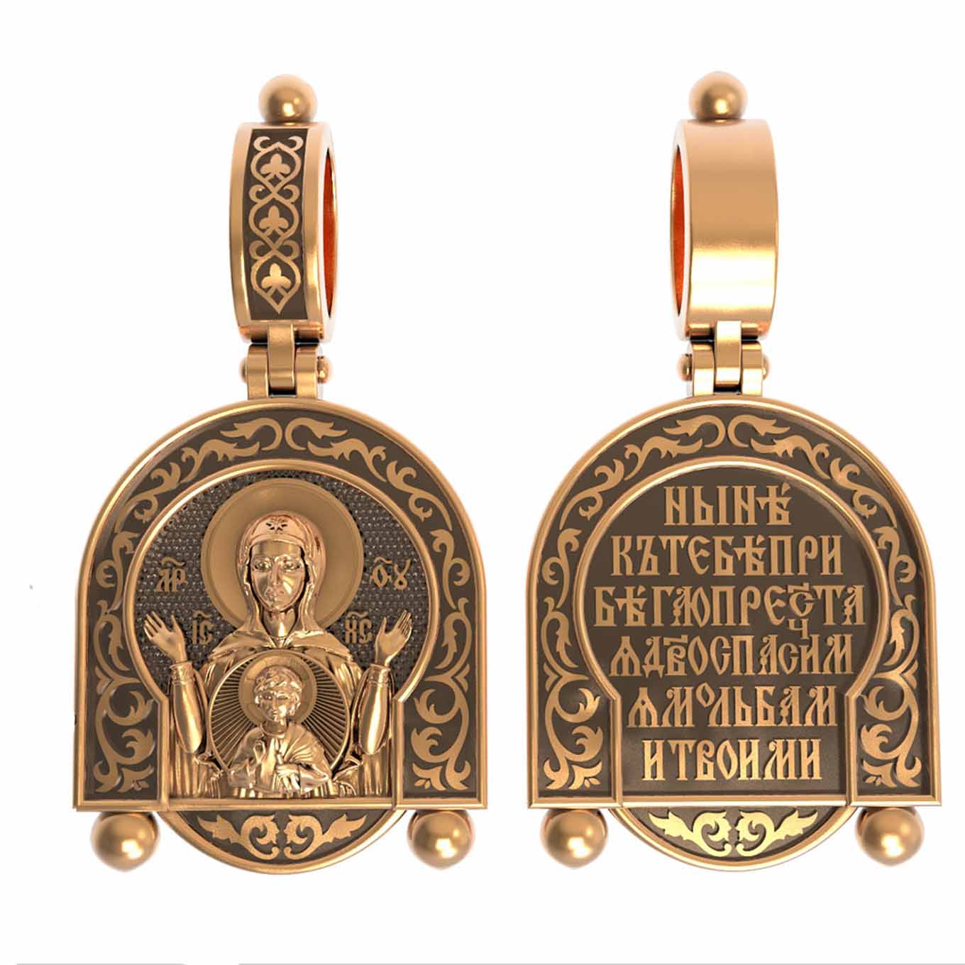В центр образка помещен образ Божией Матери «Знамение», прославившийся многими чудесами в Новгороде в XII веке. Икона эта чтится как одна из самых великих святынь Русской земли. Молитвенно воздетые руки Богородицы означают заступничество за людей пред Богом. Рядом с Ней, на фоне круглого щита, — благословляющий Божественный Младенец — Спас-Эммануил.