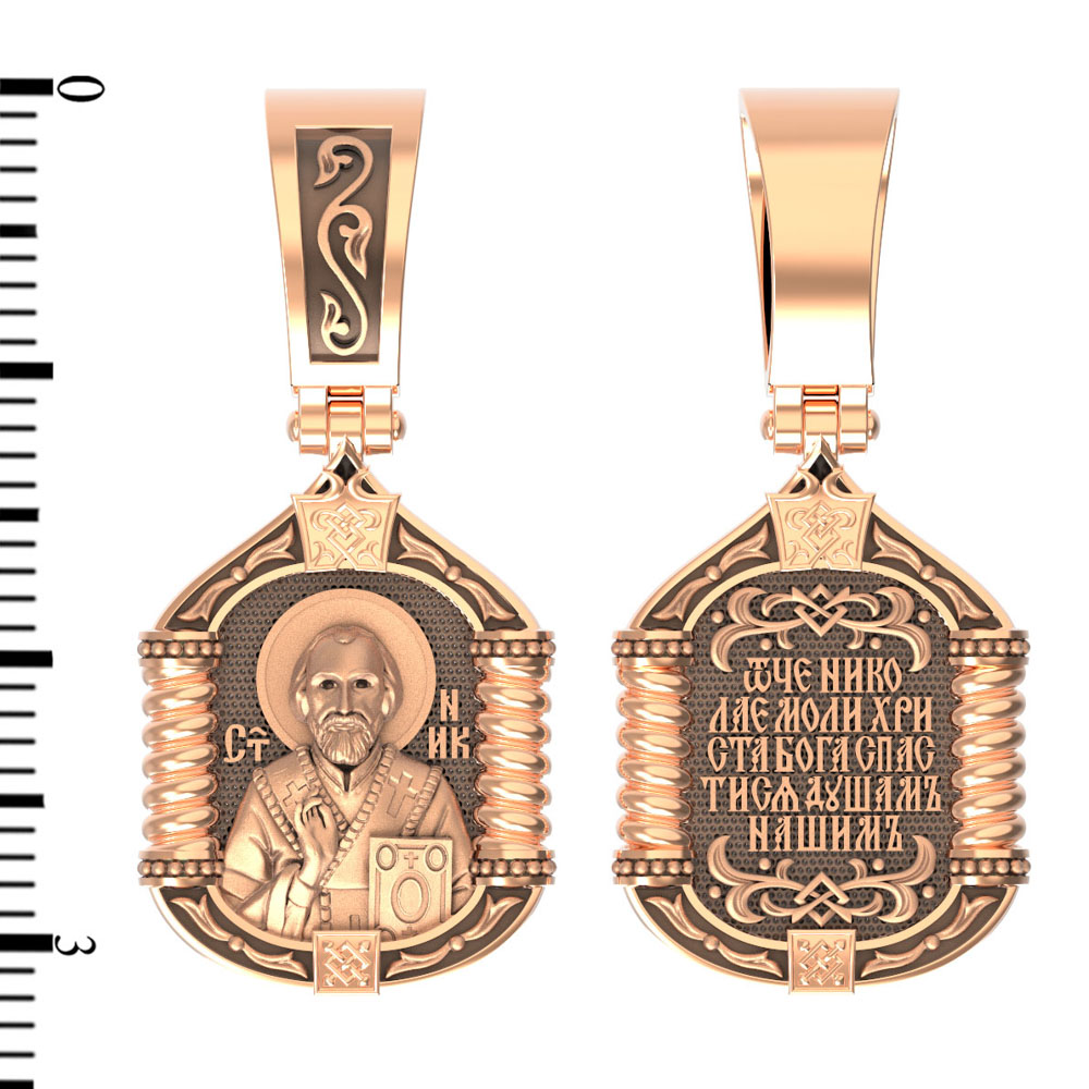 На лицевой стороне образка изображен Святитель Николай архиепископ Мир Ликийских, Чудотворец. Он является одним из самых почитаемых святых в православном мире. Святитель Николай родился во второй половине III века в Малой Азии в Ликийском городе Патары. С рождения Божий Угодник проявлял необыкновенные дарования. Сохранилось Предание, что во время крещения он, никем не поддерживаемый, простоял в купели три часа. Приняв сан священника, святитель Николай стал проводить еще более строгую подвижническую жизнь. Избранник Божий Николай стал вершиной всех добродетелей, поднятой до райской высоты. С кем из величайших праведников не сравнялся он образом духов­ной красоты, кому из них не последовал в своих деяниях и чудотворениях? Вся жизнь святого Николая — это служение Богу. Много великих и преславных чудес сотворил великий Святитель Николай Угодник. Он помогал сущим в бедах, укрощал штормы, спасал от потопления и выносил на сушу из глубины морской, освобождал из плена и приносил освобожденных домой, избавлял от уз и темницы, защищал от посечения мечом, освобождал от смерти и подавал многим различные исцеления, слепым прозрение, хромым хождение, глухим слух, немым дар слова.