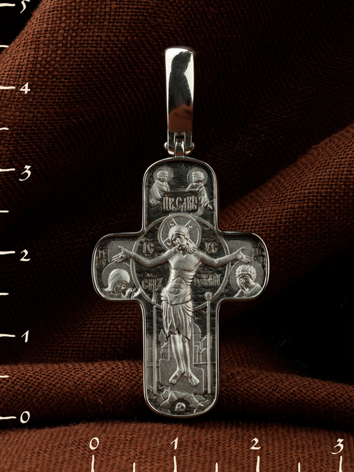 На лицевой стороне креста изображено Распятие Господа и Спасителя нашего Иисуса Христа. Христос, подвергнутый на кресте мучительной казни, своими страданиями искупил нас от древнего греха и даровал нам жизнь вечную. Без Распятия не было бы Воскресения Христова, и поэтому Крест из орудия казни обратился в святыню, в которой действует Благодать Божия. Над Распятием помещена надпись «Царь Славы». Распятие сопровождается надписями, олицетворяющими Христа: «IС» « ХС», что означает Иисус Христос и «Сын Божий». Над вершиной Распятия помещены изображения Ангелов.. Слева от Распятия изображена Пресвятая Богородица, справа — апостол и евангелист Иоанн Богослов, один из ближайших учеников Иисуса Христа. Возвышение, на котором стоит Крест, символизирует гору Голгофу, на которой произошло Распятие. Под подножием Креста изображена покоящаяся голова (череп) Адама