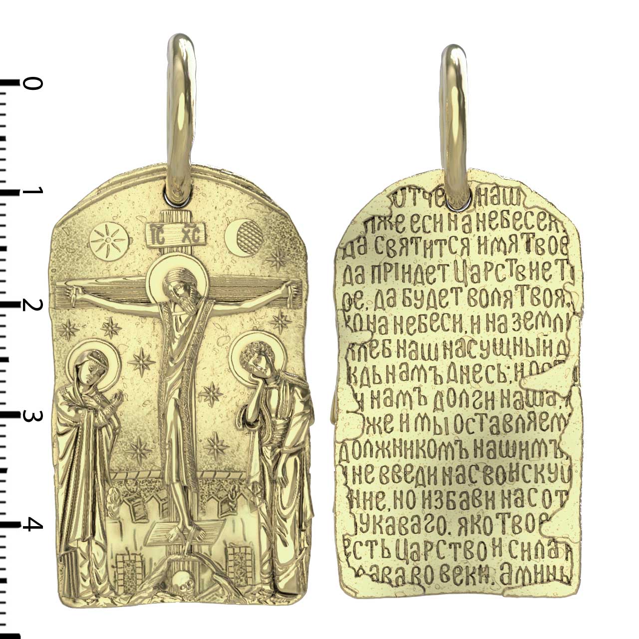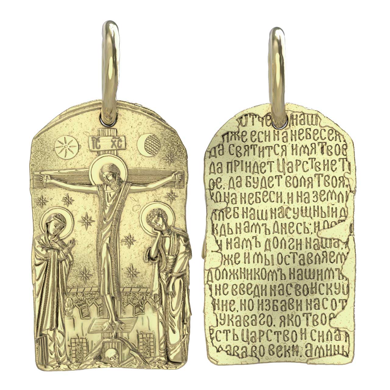 На лицевой стороне образка изображено Распятие Господа и Спасителя нашего Иисуса Христа. Своими крестными страданиями Господь смыл наши грехи, покрыл наш долг перед Богом. В Голгофе сокрыта непостижимая тайна бесконечной правды и любви Бога. Крест стал символом победы добра над злом, жизни над смертью, напоминанием бесконечной Божьей любви, предметом радости. Воплотившийся Сын Божий Своею кровью освятил крест и сделал его проводником Своей благодати, источником освящения верующих. На верхней табличке, выше головы Иисуса, написано сокращенно имя Спасителя «IC» «XC» — Иисус Христос. Слева от Распятия стоят оплакивающие Господа Пресвятая Богородица, справа — апостол и евангелист Иоанн Богослов, один из ближайших учеников Иисуса Христа. По преданию, увидя, что они горько плачут, Иисус сказал Матери Своей: «Жено! Се сын Твой!» Потом сказал ученику Иоанну: «Се мати твоя». С этого времени Иоанн взял Матерь Божию к себе, и Она жила в его доме до самой смерти.