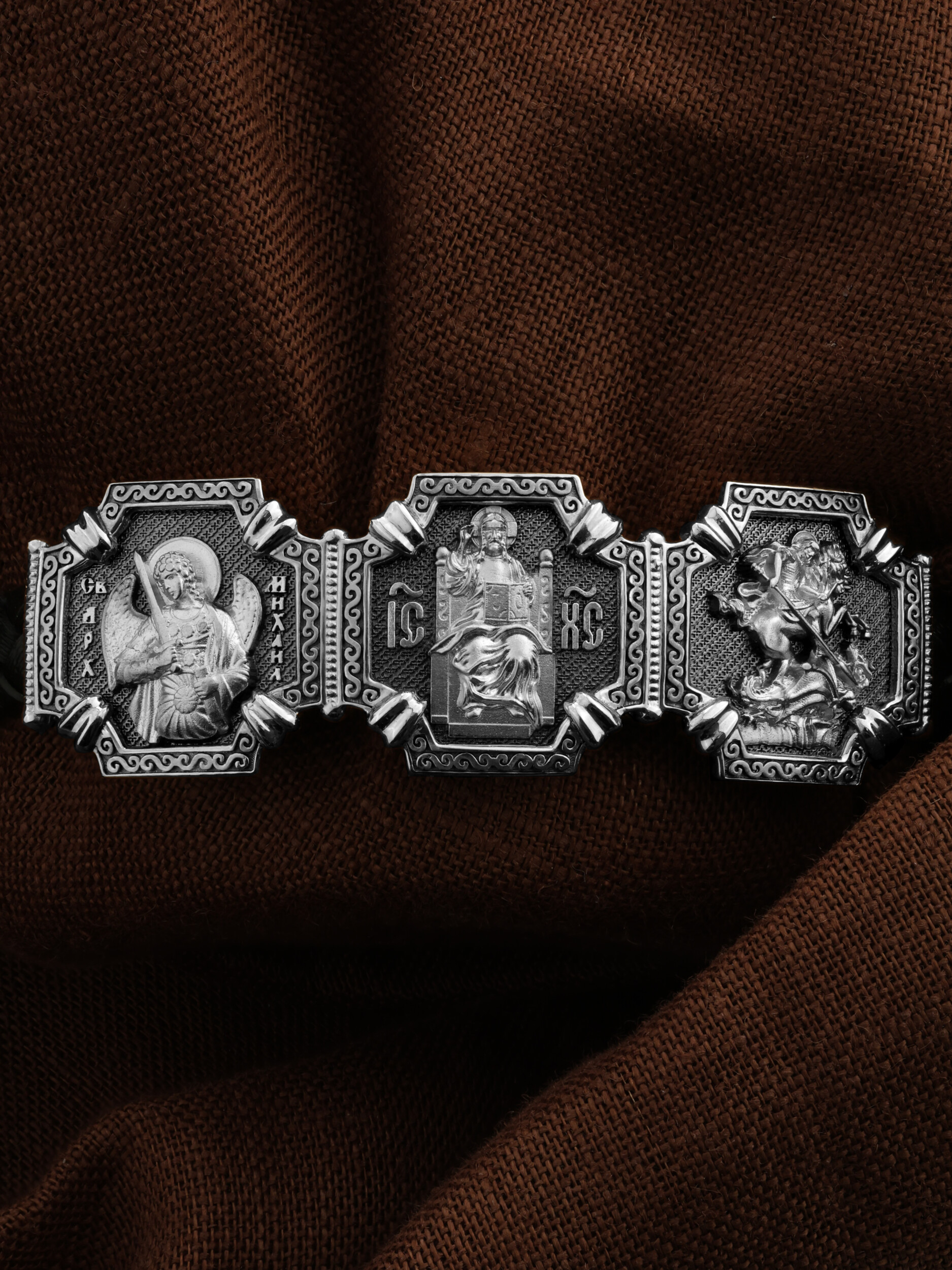 Композиционным центром браслета является Иисус Христос в образе Вседержителя, по-гречески «Пантократор». Это древнейший образ Спасителя, на котором Он представлен как властелин и правитель мира. Христос держит в руках Книгу, которая символизирует Книгу Бытия, то есть весь сотворенный Богом мир. В этой Книге судьбы всех людей, живущих на земле. Слева от образа Вседержителя — икона Архангела Михаила — Архистратига всех Небесных Воинств. Он ведет непримиримую войну против сил зла, охраняет райские врата и защищает души людей. Его имя означает «Кто яко Бог?», так как он самый могучий и грозный враг зла. Он первым ополчился на Денницу, когда тот восстал против Бога, низверг его с Неба и не перестает сражаться с его темным воинством. Поэтому он часто изображается в виде воина, в доспехах и с огненным мечом. Справа от образа Вседержителя — Великомученик Георгий Победоносец. Образ Великомученика считают одним из наиболее чтимых святынь в Святыни Православных, он олицетворяет собой заступника для верующих, чья жизнь имеет какое-либо отношение к военным делам, также он может оберегать и землевладельцев. Одно из самых великих чудес которое сотворил Великомученик так это — спасения всего города от устрашающего змия. Молитвами и своей непреклонной верой, взываемой к Всевышнему, он смог одолеть чудовище. Святой убил змея, спас жителей и их души от влияния дьявола, породив в них надежду и веру в Господа, призывая людей принять христианскую веру. Поскольку при жизни Святой Георгий был военным, он считается покровителем всех, кто имеет отношение к армии — военнослужащим, участникам боевых действий. Молитва перед иконой Георгия Победоносца поможет защититься от врагов, одержать победу в сражении (военном, спортивном, духовной брани с дьяволом), содействие в установлении мир