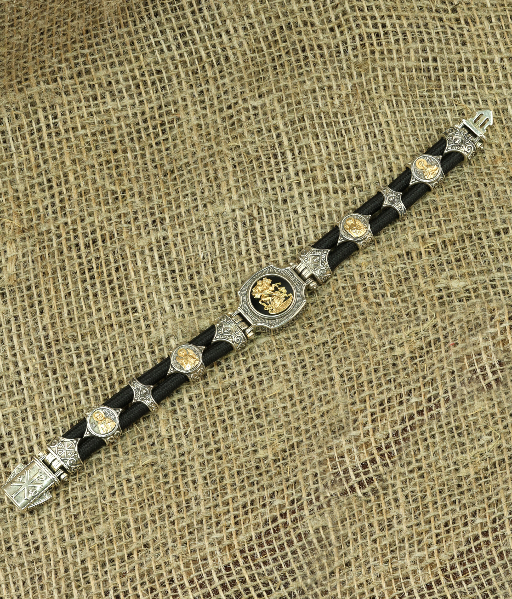 Браслет из серебра и золота c ониксом и шёлковым шнурком