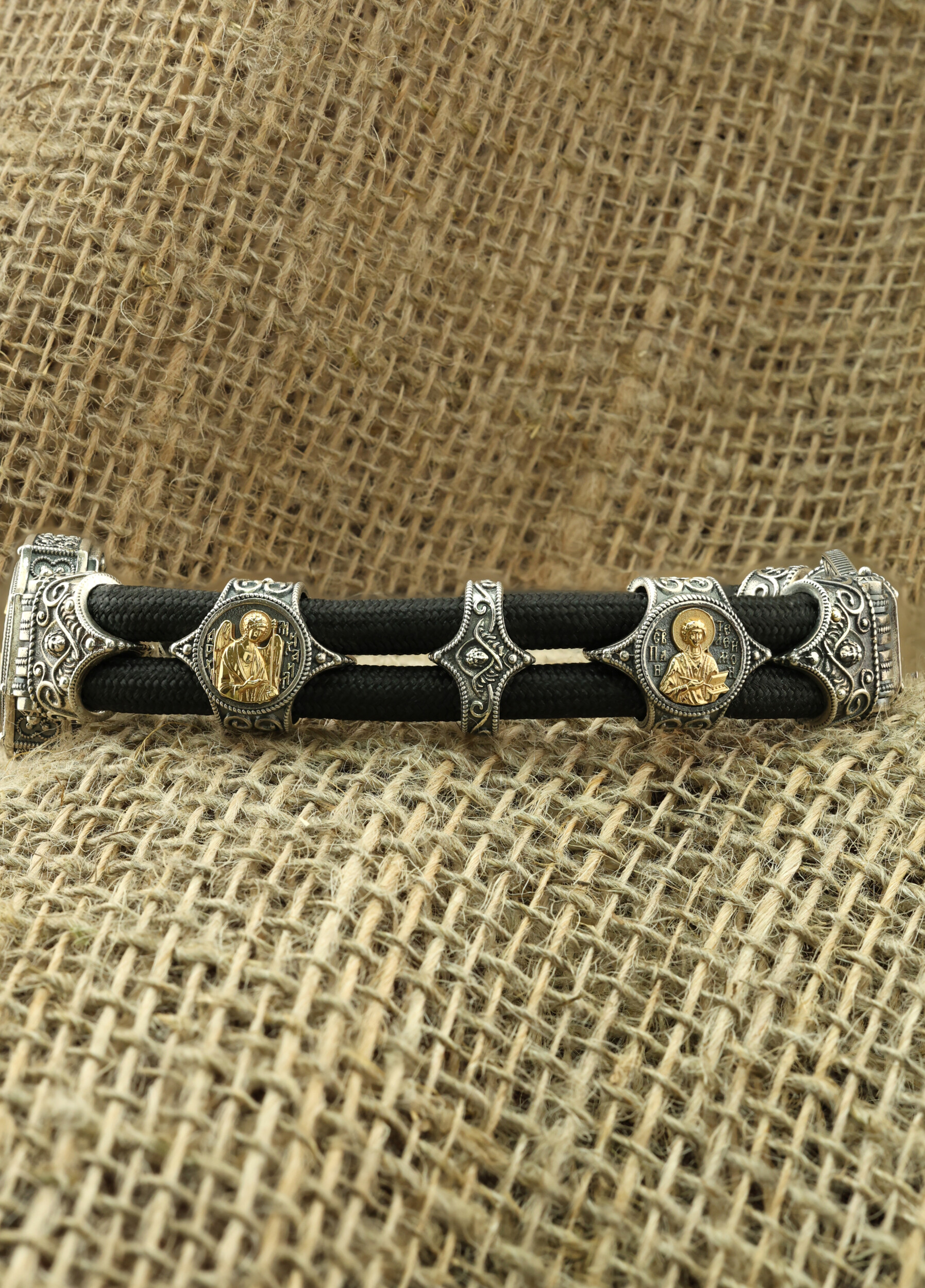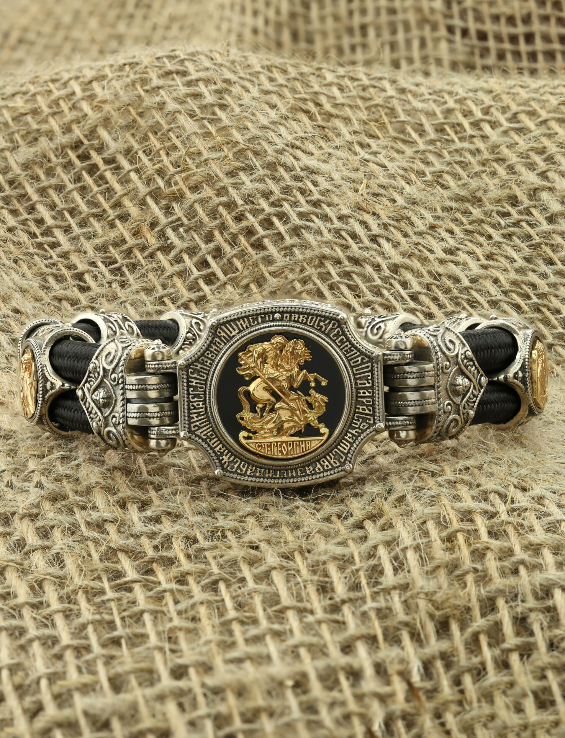 Браслет из серебра и золота c ониксом и шёлковым шнурком