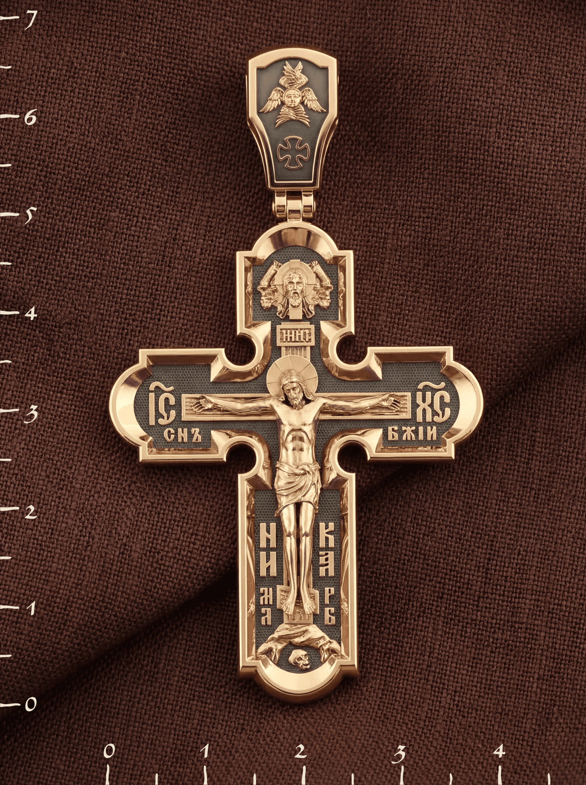 На лицевой стороне нательного креста по традиции изображено Распятие Господа нашего Иисуса Христа. Крест Господень стоит на небольшом каменистом возвышении, символизирующем гору Голгофу, которая обозначена буквами МЛРБ (Место Лобное Рай Бысть). Над головой Господа на поперечной перекладине написано «ИНЦИ», что символизирует табличку, которая была прибита к Кресту, с надписью «Иисус Назорей Царь Иудейский». Этим иудеи хотели посмеяться над Христом, не зная, что распинают истинного Царя всех царей. По сторонам основной перекладины расположены позолоченные рельефные инициалы Христа «ИС ХС». Под перекладиной, по сторонам древа, находится надпись «СЫН БОЖИЙ», а в основании креста — надпись «НИКА» (Победитель).