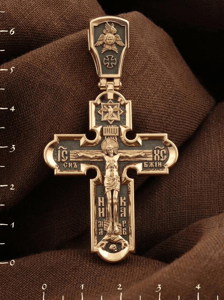 На лицевой стороне креста изображено Распятие Иисуса Христа. Господь представлен свободно покоящимся на кресте с простертыми руками и как бы обнимающим всю Вселенную. Он — Спаситель, искупивший грехи мира, «поправший смертию смерть» и призывающий к Себе «все концы земли». Поэтому рядом с Его образом помещены слова — «НИКА» и «Царь Славы». Эти слова характеризуют Господа как Великого Архиерея, победителя смерти. Верхняя перекладина символизирует титло — табличку, на которой, согласно Евангелию, было начертано: Иисус Назорей Царь Иудейский (IНЦI). Также Распятие сопровождается надписями, олицетворяющими Христа. Это святое имя Христа «IC» (Иисус) «ХС» (Христос), и словосочетание «СЫН БОЖИЙ». Крест стоит на горе камней, символизирующих Голгофу, в основании которой различается череп. Это голова Адама. На кулонном кольце помещено изображение серафима.
