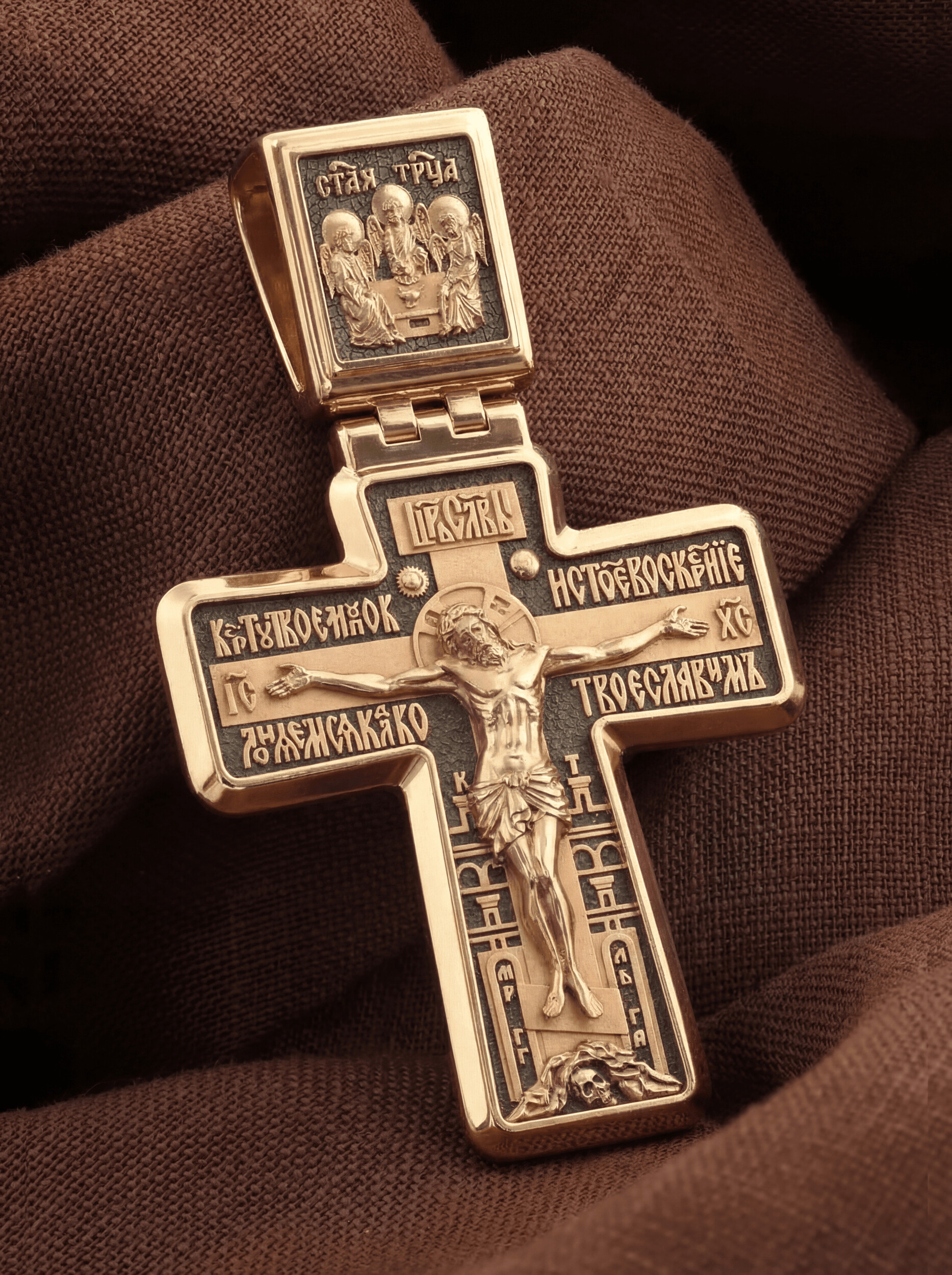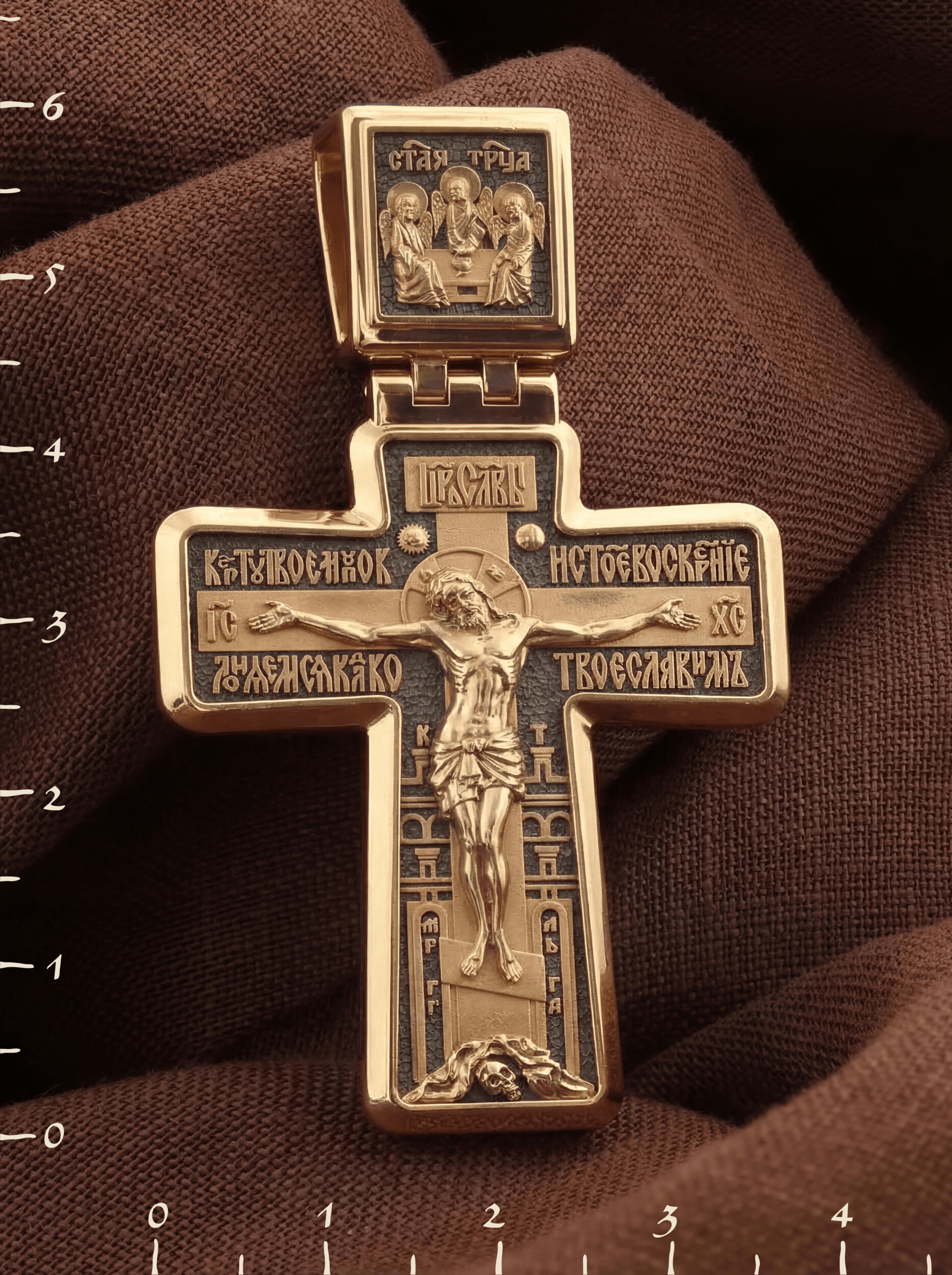 На лицевой стороне креста изображено Распятие Иисуса Христа. Позади Его изображена иерусалимская стена, знак того, что Господь был распят вне стен города. Но вместе с тем стена знаменует и Небесный Иерусалим, путь в который открылся для человечества через Голгофу: «МЛРБ», «Место Лобное Рай Бысть» — написано у ее основания. Рядом с Его образом помещены слова «Царь Славы». Эти слова характеризуют Господа как Великого Архиерея, победителя смерти. Верхняя перекладина символизирует титло — табличку, на которой, согласно Евангелию, было начертано: «Иисус Назорей Царь Иудейский» (IНЦI). Также Распятие сопровождается надписями, олицетворяющими Христа. Это святое имя Христа «IC» (Иисус) «ХС» (Христос), и словосочетание «Сын Божий», а так же написан тропарь Животворящему Кресту: «Кресту Твоему поклоняемся, Владыко, и святое воскресение Твое славим». Распятие стоит на горе камней, символизирующих Голгофу, в основании которой различается череп. Это голова Адама. На кулонном кольце помещено изображение Святой Троицы.
