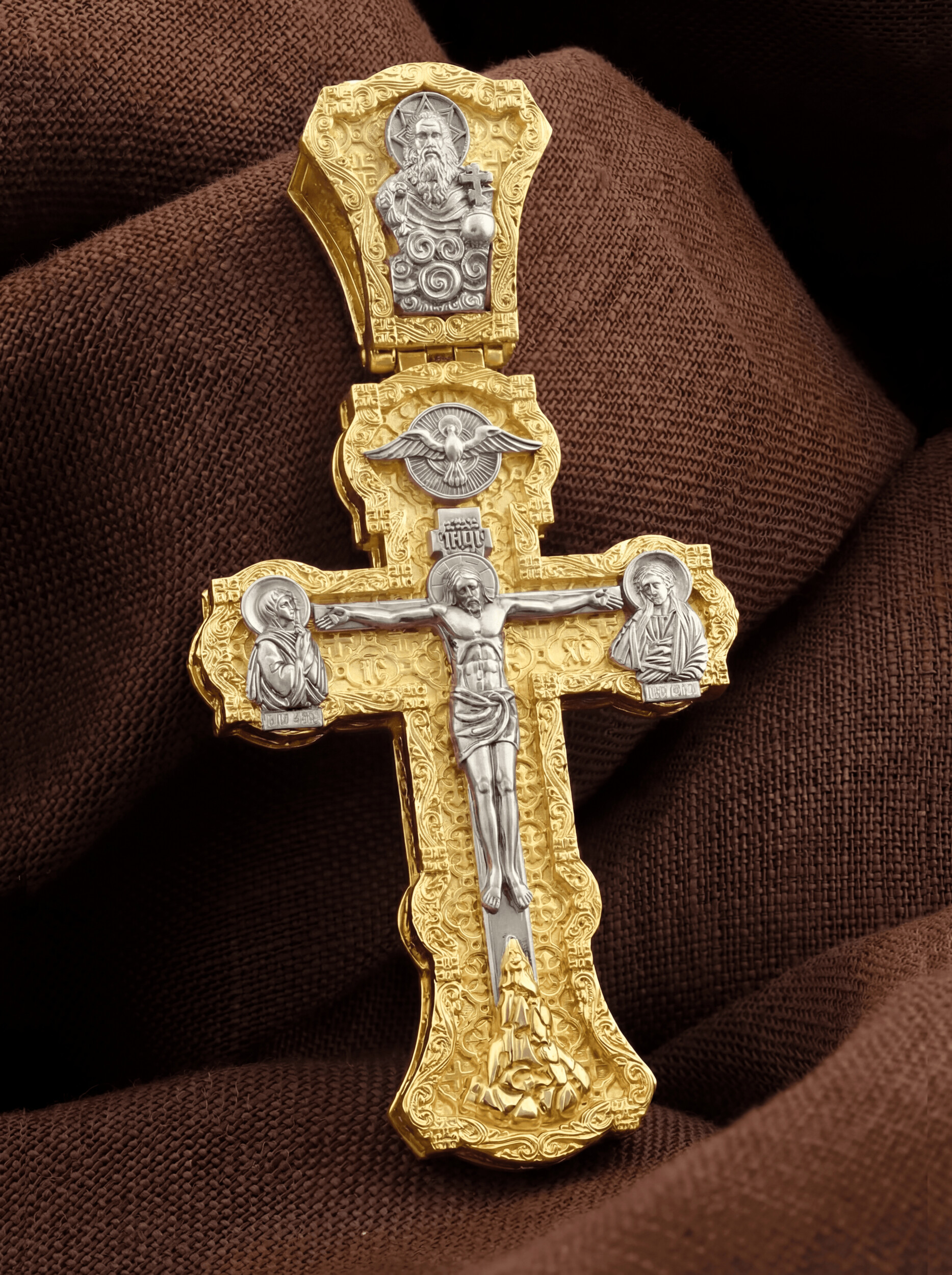 На лицевой стороне креста изображено Распятие Господа и Спасителя нашего Иисуса Христа. Христос, подвергнутый на кресте мучительной казни, своими страданиями искупил нас от древнего греха и даровал нам жизнь вечную. Без Распятия не было бы Воскресения Христова, и поэтому Крест из орудия казни обратился в святыню, в которой действует Благодать Божия. На верхней табличке, выше головы Иисуса, расположена надпись, составленная Понтием Пилатом на трех языках — «IНЦI». Она означает «Иисус Назорей, Царь Иудейский». Надпись «IС ХС» означает Иисус Христос и помещается на разных сторонах поперечной (большой) перекладины креста. Крест стоит на горе камней, символизирующих Голгофу. В ее основании различается череп– это голова Адама. У Креста стоят оплакивающие Господа Божия Матерь и апостол Иоанн Богослов. Из всех апостолов об одном лишь Иоанне Богослове говорится, что он стоял на Голгофе у креста Спасителя, не заботясь о собственной безопасности. Он услышал обращенные к Ней с высоты Креста слова Распятого Господа: «Жено, се сын Твой» и к нему: «Се Мати твоя». С этого времени Иоанн взял Матерь Божию к себе, и Она жила в его доме до самой смерти. Над Распятием — изображение Духа Святого в виде голубя, сходящего с Небес. На кулонном кольце изображен Бог Отец.