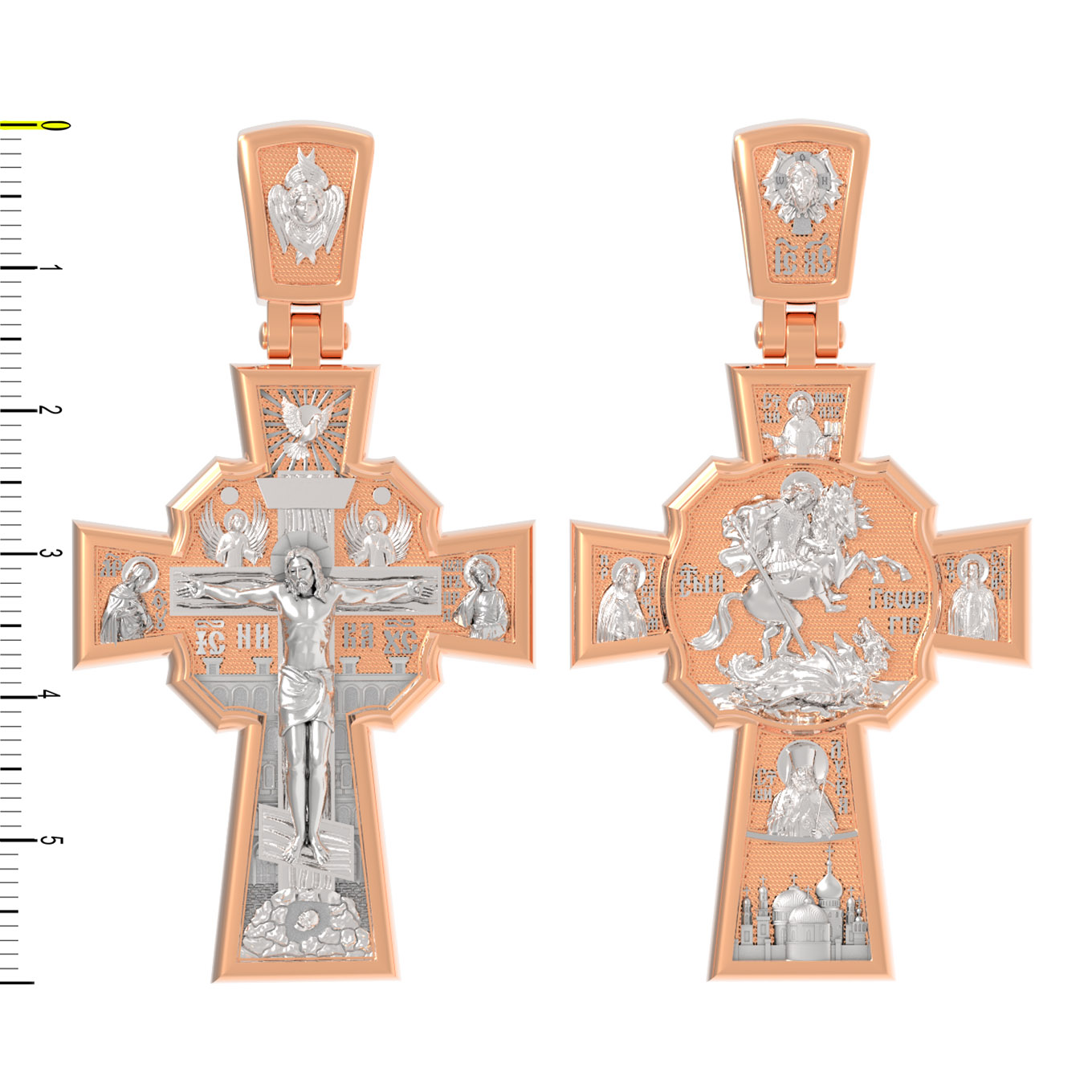 В центре оборотной стороне креста помещен образ Святого Великомученика Георгия Победоносца — одного из самых почитаемых и удивительных святых. На образке он изображен как воитель поражающий копьем огнедышащего змея. Змей символизирует собою сатанинские силы. Справа помещен образ Святого Преподобного Сергия, игумена Радонежского, чудотворца, слева — Преподобного Серафима Саровского, чудотвореца. Выше помещен образ Святителя Николая архиепископа Мир Ликийских, чудотвореца, ниже — образ святителя Луки (Войно-Ясенецкого), архиепископа Симферопольского и Крымского, исповедника и изображение Храма. На кулонном кольце изображен Спас Нерукотворный — образ Господа и Спасителя нашего Иисуса Христа, чудесно отпечатавшийся на плате, котором Христос вытер свой лик.