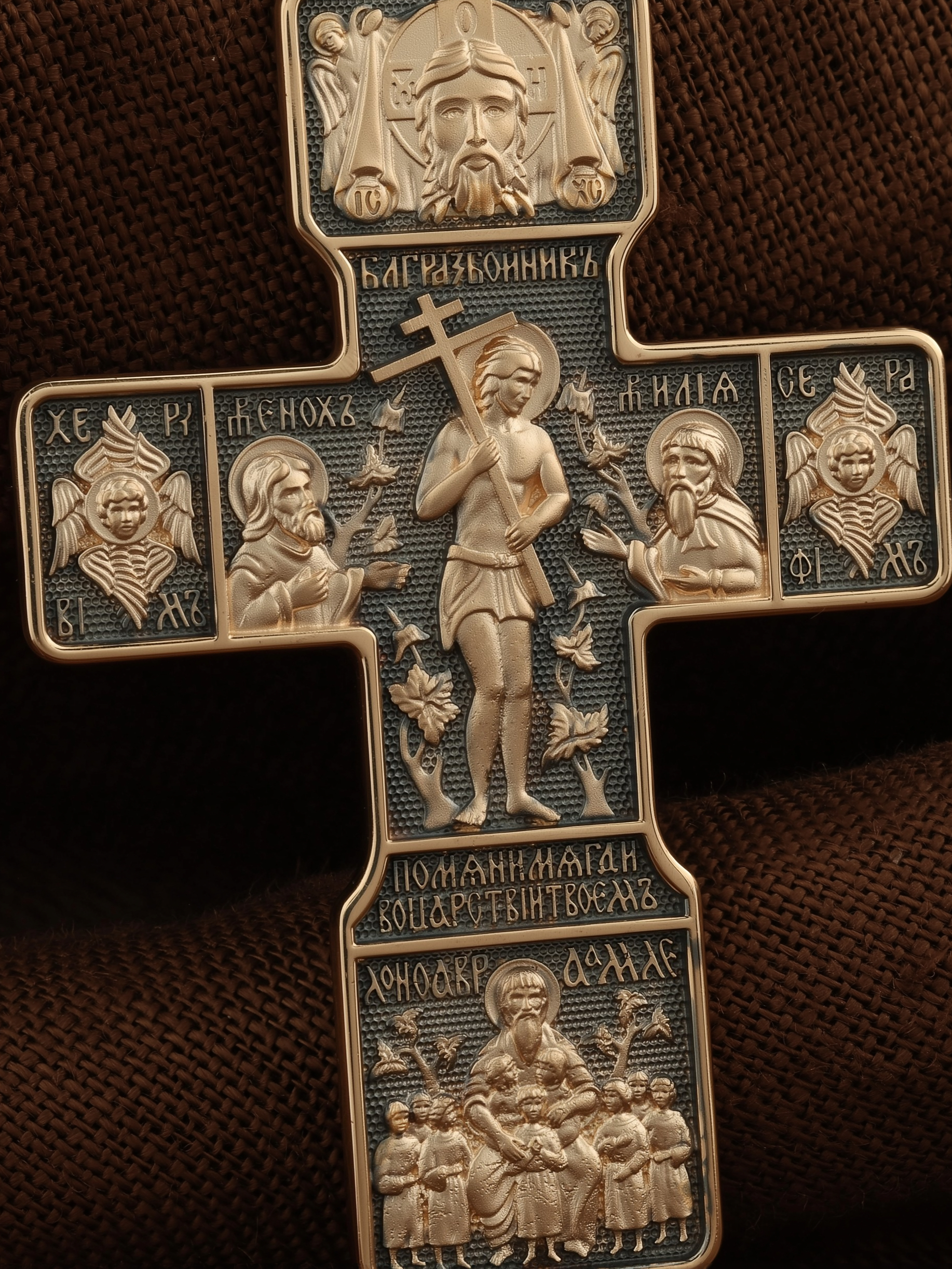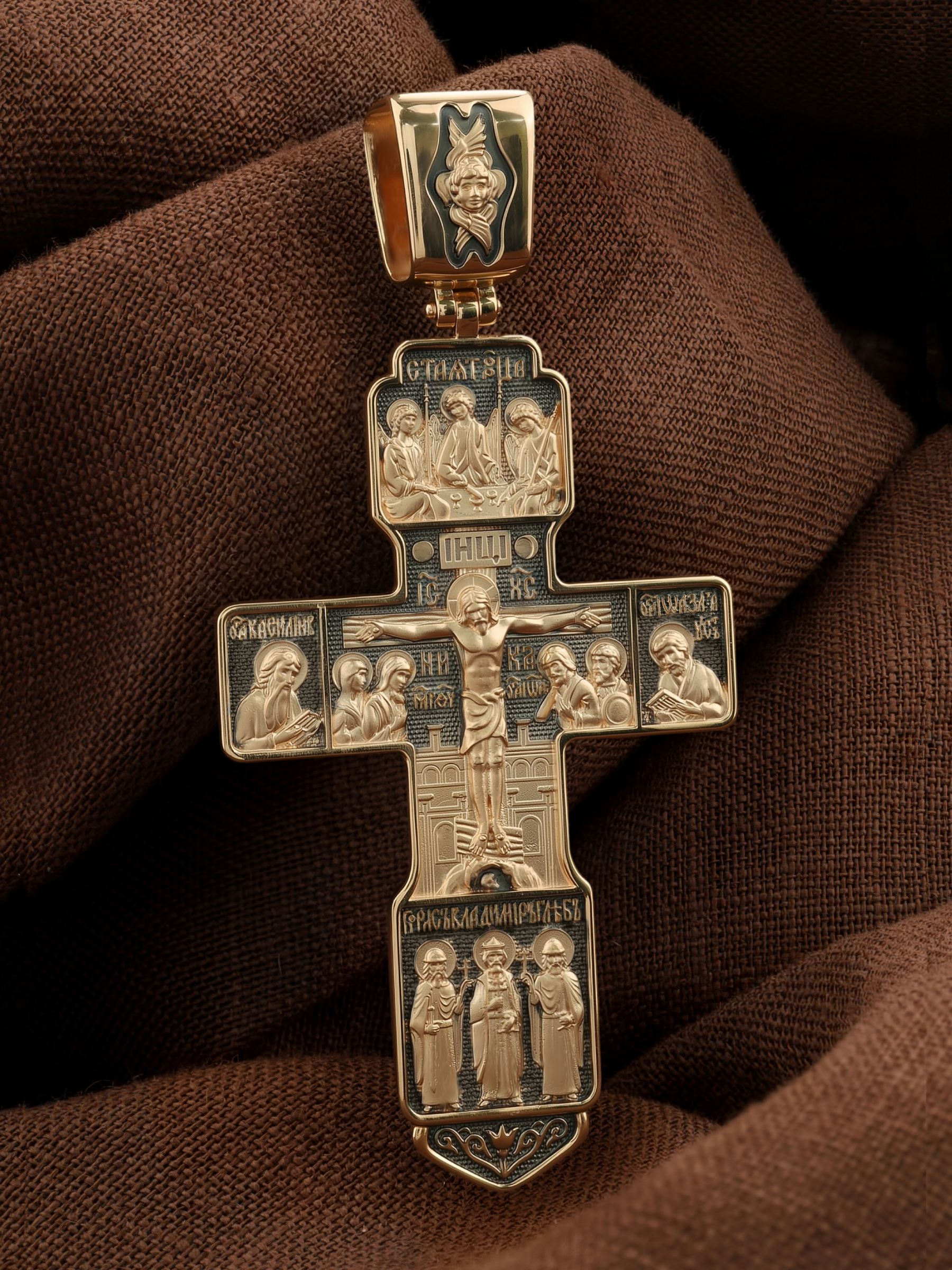 На концах горизонтальной балки креста помещены образы вселенских святителей и творцов литургии Василия Великого и Иоанна Златоуста. В кулонном кольце изображены райские врата с их стражем — Херувимом. Врата, которые открылись благодаря крестной жертве Христа.