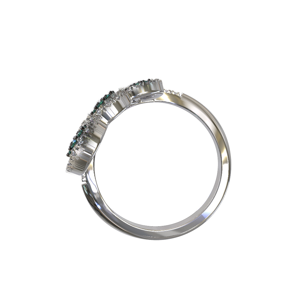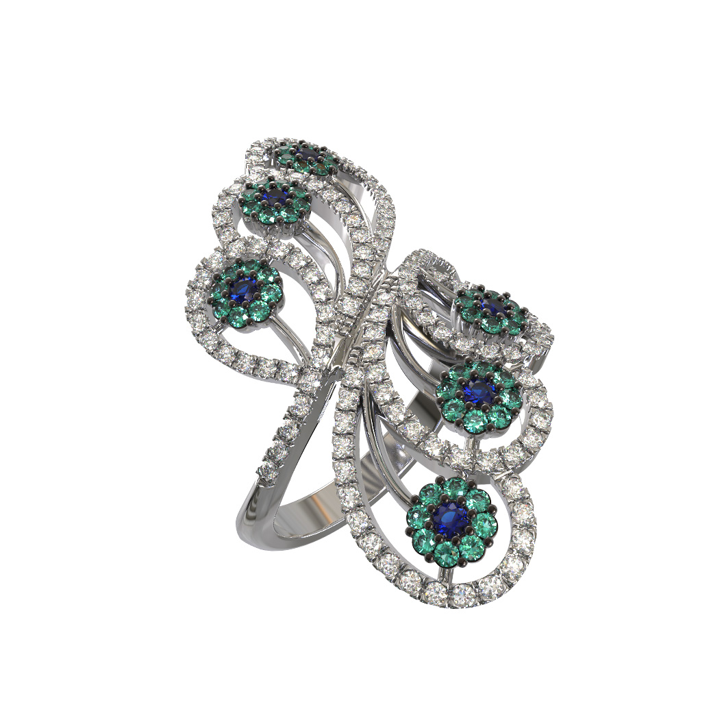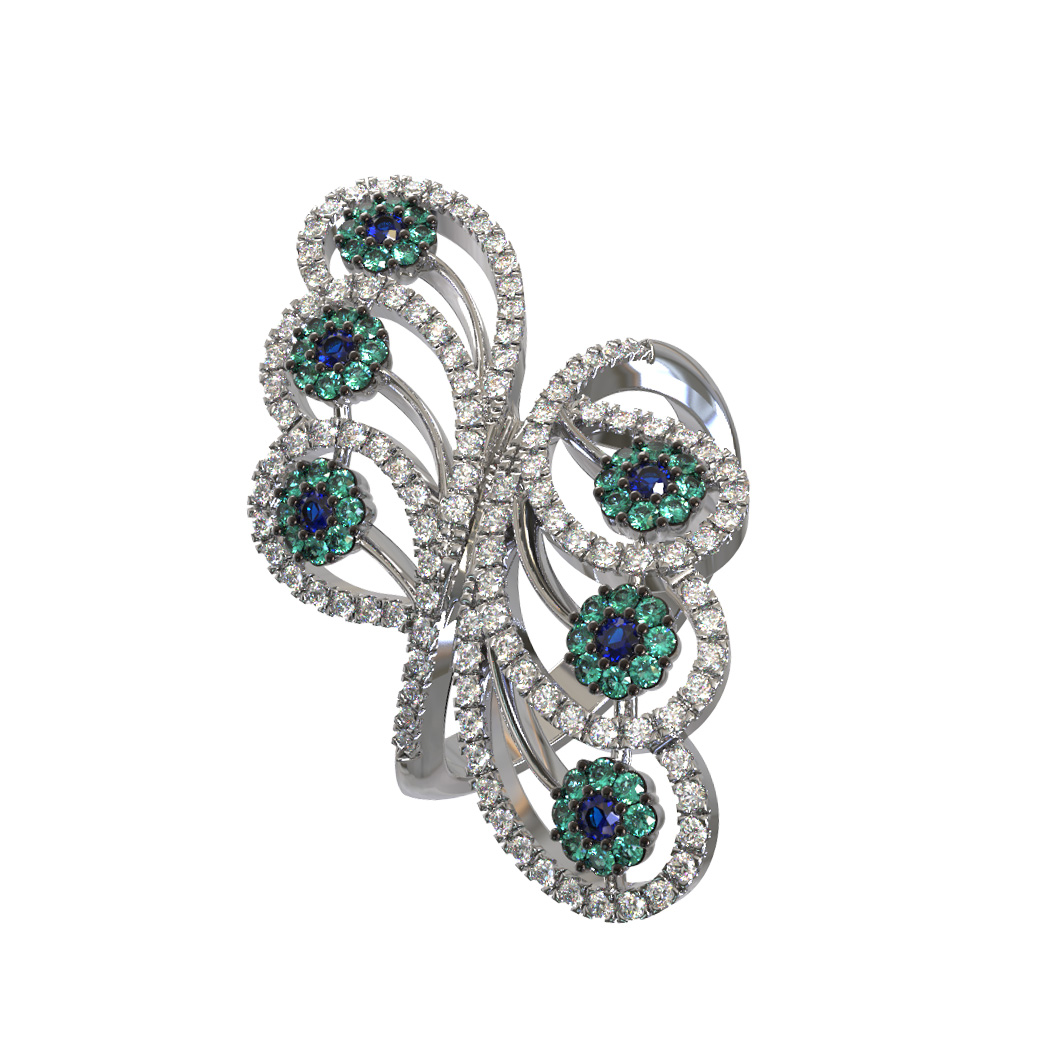 Кольцо из белого золота c бриллиантами, сапфиром и изумрудом