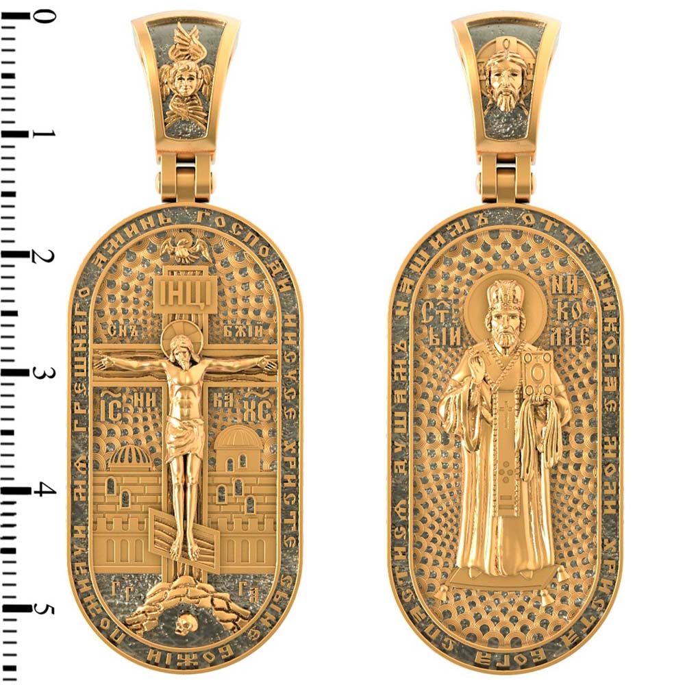 На оборотной стороне изображен Святой Николай Чудотворец, которого еще называют Николай Угодник — помощник в делах, покровитель учащихся, утешитель обиженных и нуждающихся, целитель самых страшных и тяжелых недугов, предстатель и молитвенник за людей перед Богом. Также Святитель Николай Чудотворец известен своими молитвами за путешественников, когда непрестанный ветер и бушующие волны утихают и корабль заходит в спокойную гавань. По контуру написана молитва: «Отче, Николай, моли Христа Бога спастися душам нашим». На кулонном кольце помещено изображение Спаса Нерукотворного.