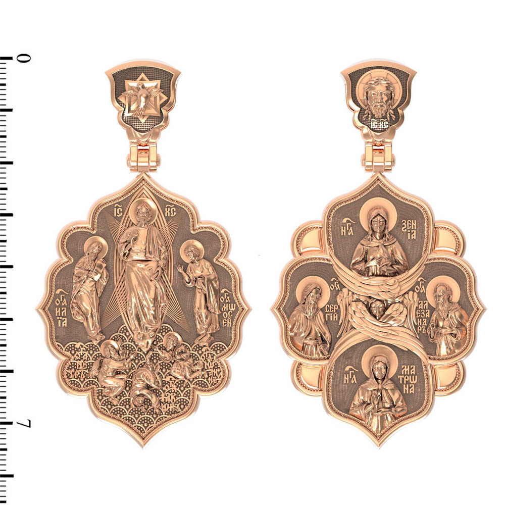 На лицевой стороне образка изображена икона «Преображение». Образ являет Господа Иисуса Христа в тот момент, когда Он преобразился во время молитвы перед тремя Своими учениками: Петром, Иаковом и Иоанном Богословом. Пророки Моисей и Илия предстояли рядом и беседовали с Ним. Апостолы едва могли вынести бесконечную радость, которая охватила их в присутствии Бога. Когда же на гору спустилось облако и раздался глас Божий: «Сей есть Сын Мой Возлюбленный; Его слушайте», апостолы в сильном страхе пали на землю (Лк. 9:35). На иконах «Преображение» они так и изображаются — лежащими у ног Христа.