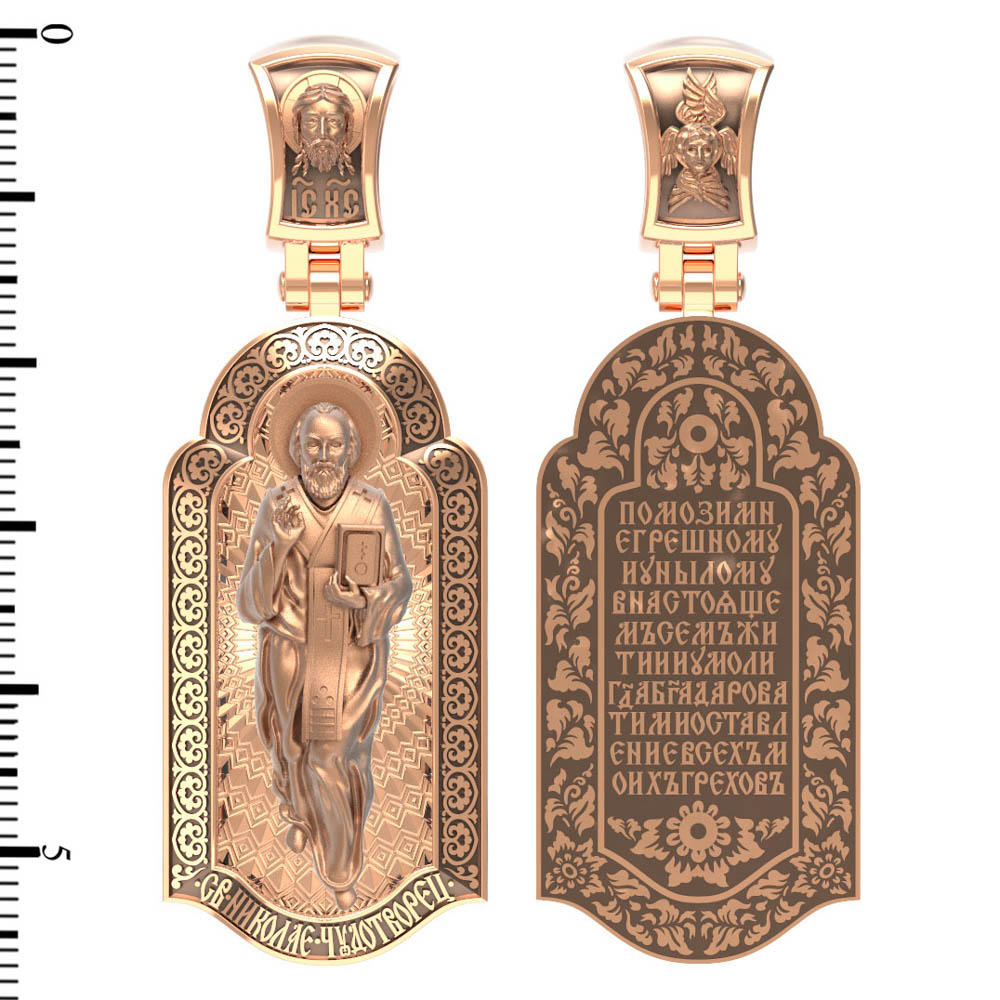 На лицевой стороне образка изображен Святитель Николай архиепископ Мир Ликийских, Чудотворец. Он является одним из самых почитаемых святых в православном мире. Избранник Божий Николай стал вершиной всех добродетелей. С кем из величайших праведников не сравнялся он образом духовной красоты, кому из них не последовал в своих деяниях и чудотворениях? Всеблаженный Николай был кроток, как Моисей, мужественен, как Давид, славен простотой нрава, как Иаков. Словно Ной, он спасал стадо Господне в новом ковчеге от потопа ересей. Вся жизнь святого Николая — это служение Богу. Много великих чудес сотворил на земле и на море великий Святитель Николай Угодник. Он укрощал штормы, спасал от потопления и выносил на сушу из глубины морской, освобождал из плена и приносил освобожденных домой, избавлял от уз и темницы, освобождал от смерти и подавал многим различные исцеления: слепым — прозрение, хромым — хождение, глухим — слух.