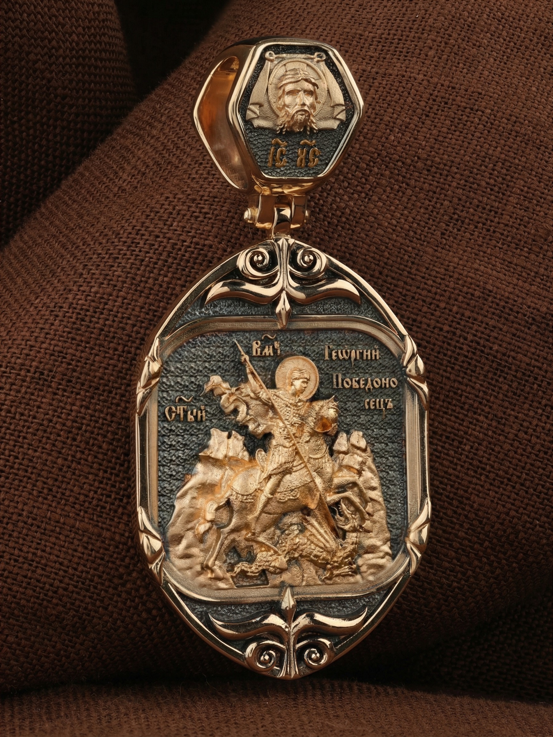 Основой композиции лицевой стороны является изображение Святого Георгия Победоносца. Святой Георгий — один из наиболее почитаемых святых в Христианской Церкви. На Руси он известен как Юрий или Егорий, покровитель воинов, помощник в крестьянском труде. На образке изображено самое знаменитое чудо святого: спасение принцессы от змея, которому она предназначалась в жертву. Чудо это имеет символическое толкование. Принцесса означает душу человеческую, а змей — дьявола, желающего ее поглотить. Св. Георгий, небесный защитник, спускается с Небес, чтобы помочь душе избавиться от гибели.