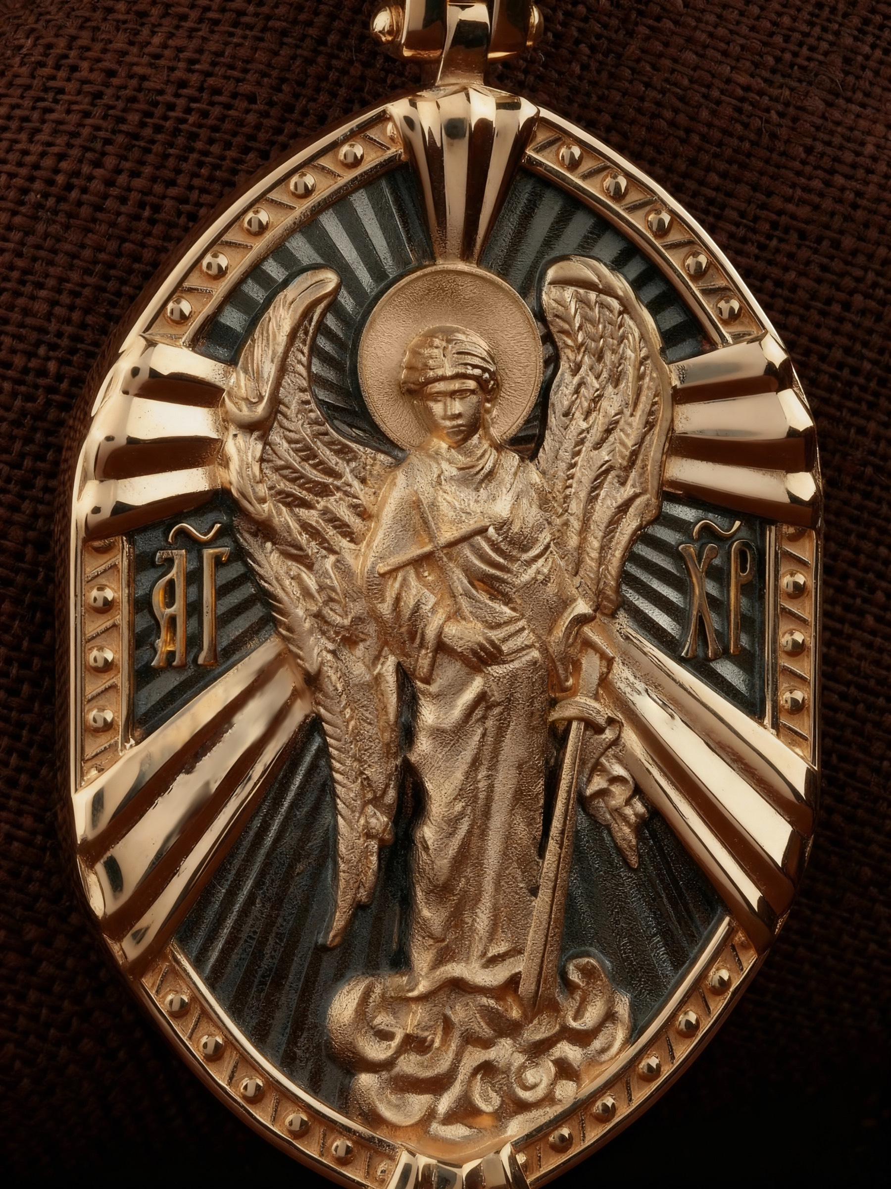 На оборотной стороне креста изображена прямостоящая фигура Ангела Хранителя с традиционными атрибутами в руках: крестом, которым он осеняет человека, и мечом для прогнания бесов. По Православному учению, каждому, принявшему святое крещение, дается Господом Ангел Хранитель, который сопровождает человека всю его жизнь, помогая в добрых делах и охраняя от нападок злых духов. Святые отцы утверждают, что только верующий человек имеет рядом с собой Ангела Хранителя: «Тем, которые сподобились крещения и возносятся на высоту добродетелей, даны от Бога Ангелы, заботящиеся о них и содействующие им. В этом уверяет нас Господь, когда говорит, что есть Ангелы Хранители у всякого, кто верует в Него» (преп. Анастасий Синаит). Но Ангел Хранитель пребывает с христианином, если только мы не прогоним его греховными делами, поскольку «как дым разгоняет пчел, так и грех прогоняет от нас Ангела Хранителя» (свт. Василий Великий). Но и после завершения земного пути Ангел Хранитель не покидает христианина, а помогает душе преодолеть воздушные мытарства на пути в Царство Небесное.