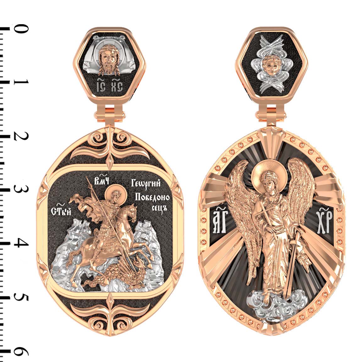 Основой композиции лицевой стороны является изображение Святого Георгия Победоносца. Святой Георгий — один из наиболее почитаемых святых в Христианской Церкви. На Руси он известен как Юрий или Егорий, покровитель воинов, помощник в крестьянском труде. На образке изображено самое знаменитое чудо святого: спасение принцессы от змея, которому она предназначалась в жертву. Чудо это имеет символическое толкование. Принцесса означает душу человеческую, а змей — дьявола, желающего ее поглотить. Св. Георгий, небесный защитник, спускается с Небес, чтобы помочь душе избавиться от гибели.
