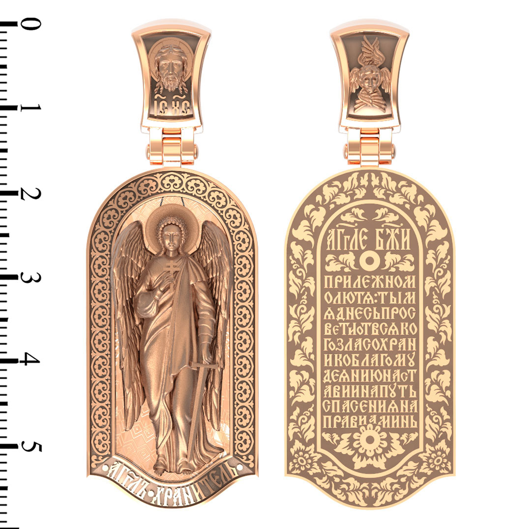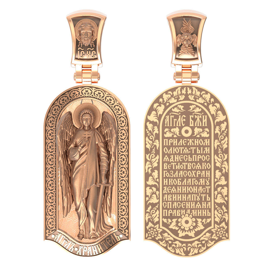 Основой композиции лицевой стороны является Ангела Хранителя. Образок Ангел Хранитель — это не просто украшение, а настоящая миниатюрная икона. В руках Ангел держит традиционные символические атрибуты Ангелов Хранителей: крест — знак послушания Христу и следования Его заповедям, меч — символ непримиримой борьбы, которую он ведет с бесами, отражая их нападения на людей. Слово «ангел» означает «вестник». Ангелы — верные служители Божьи, которых Господь посылает возвещать Свои повеления. Ангелы тварны, как и люди, но имеют другую природу. На иконах они изображаются в человеческом обличье с большими крыльями. Могучие крылья ангелов символизируют быстроту, с которой они исполняют повеления Бога, а небольшие ленточки у ушей –тороки, или слухи — показывают, что они всегда слышат Его голос.