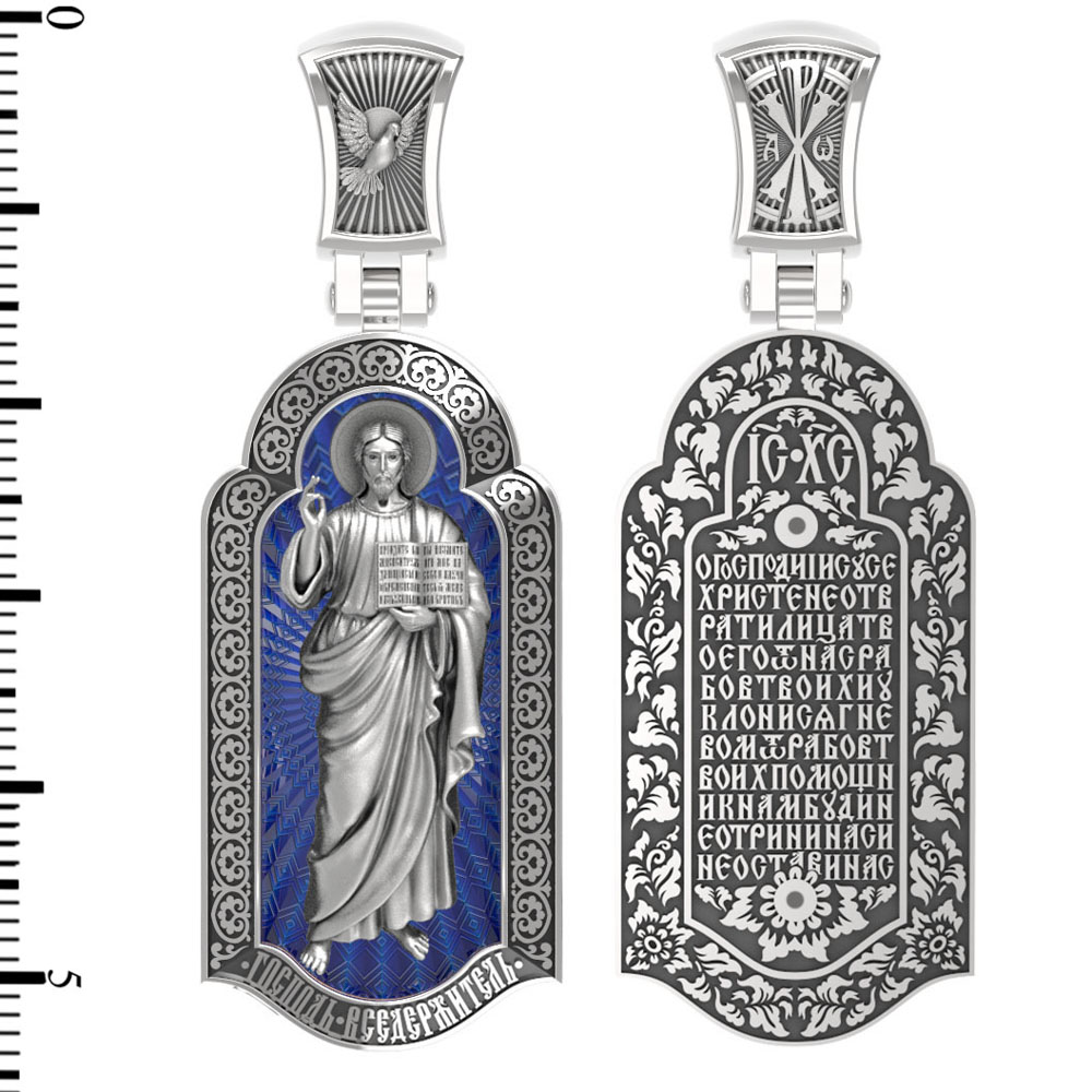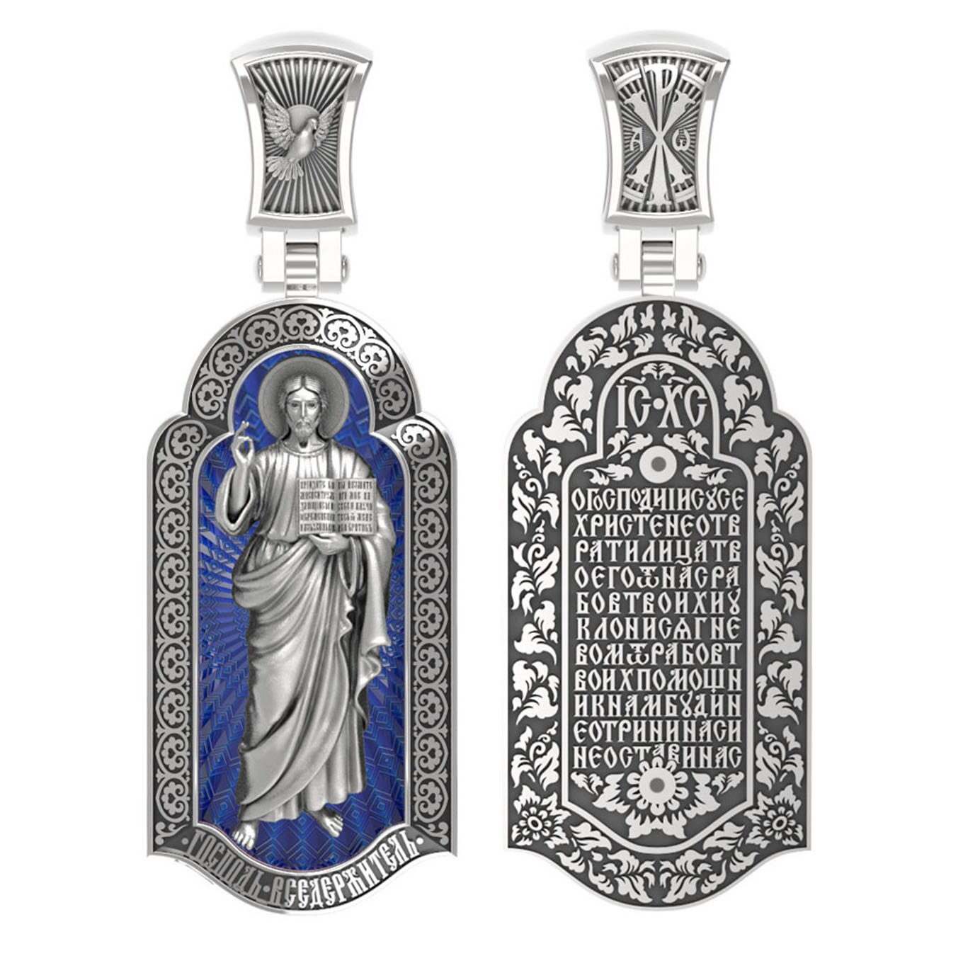 На лицевой стороне креста изображен Иисус Христос в образе Вседержителя, по-гречески «Пантократор». Это древнейший образ Спасителя, на котором Он представлен как властелин и правитель мира. Христос держит в руках Книгу, которая символизирует Книгу Бытия, то есть весь сотворенный Богом мир. В этой Книге судьбы всех людей, живущих на земле. Часто эту Книгу образно называют Книгой Жизни. Первое дошедшее до нас подобное изображение датируется VI веком и хранится в монастыре Святой Екатерины на горе Синай. Такие образы Христа с глубокой древности писались и в Палестине. Но Святая земля так часто подвергалась разграблению завоевателями, что древних икон там не осталось. Большинствоикон в храме Воскресения Христова были созданыв XIX веке.