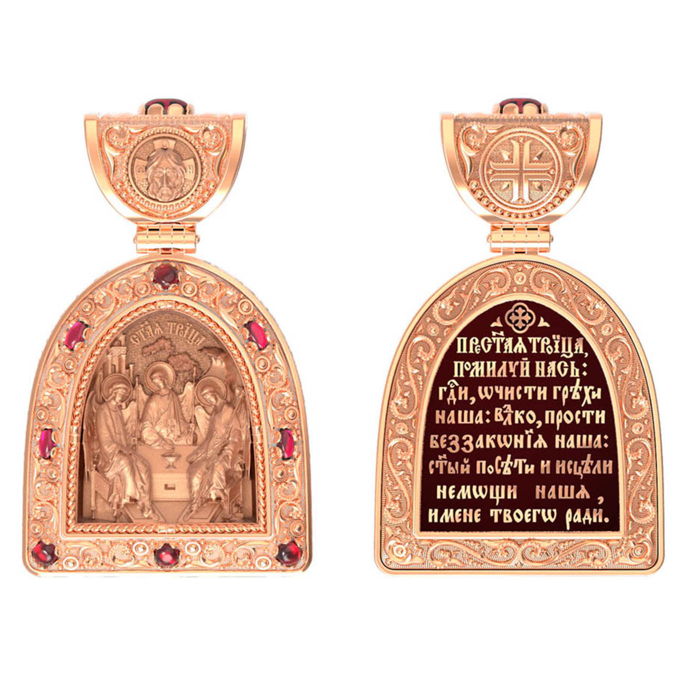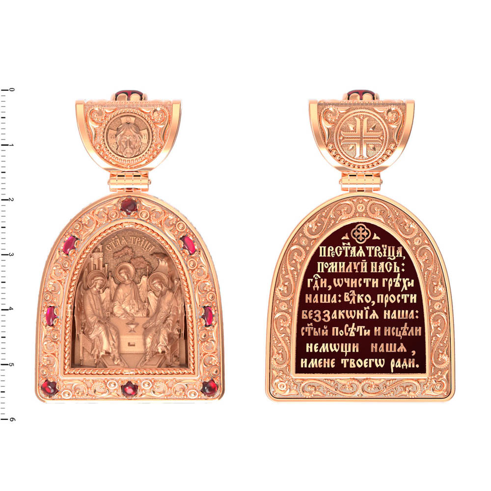 Основой композиции лицевой стороны является икона Святой Троицы.