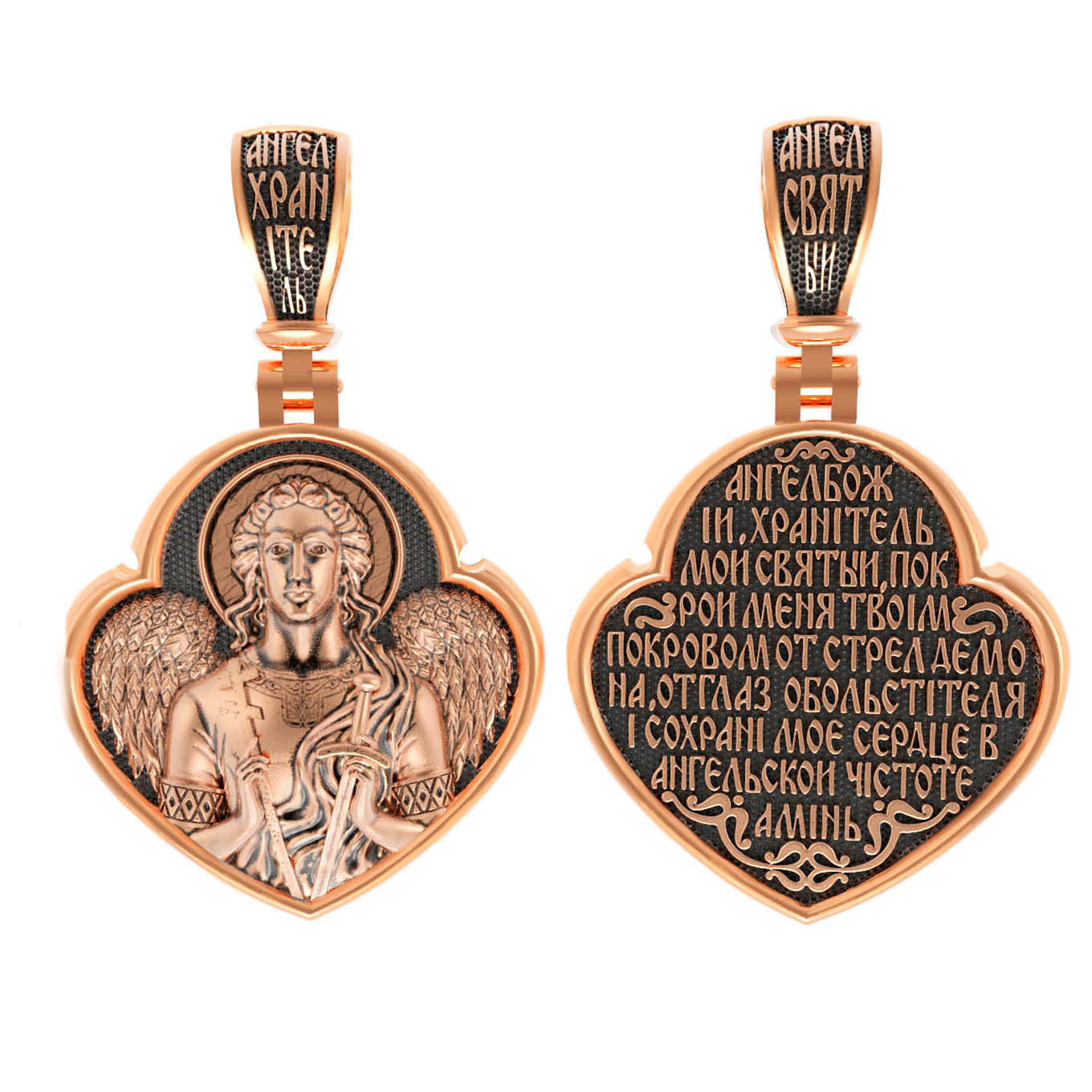 На лицевой стороне образка изображен Святой Ангел-Хранитель в виде прекрасного, светозарного юноши держащего в правой руке крест, а в левой — мечь. А? нгел-Хранитель — это Ангел приставляемый Богом к человеку при крещении для охраны и помощи в добрых делах. Он невидимо находится при человеке на протяжении всей его жизни, если человек сохраняет в себе любовь к Богу и истинную веру перед Ним. Ангел-Xранитель делают для нас все, что служит к истинному нашему благу и спасению. Невидимо пребывая при нас постоянно, он, руководствуя нас ко спасению, не только по нашему желанию таинственно наставляет нас на все доброе и полезное, не только возносит наши молитвы к Богу, но еще и сам от себя охраняют и защищают нас от врагов видимых и невидимых и ходатайствует за нас пред Богом.