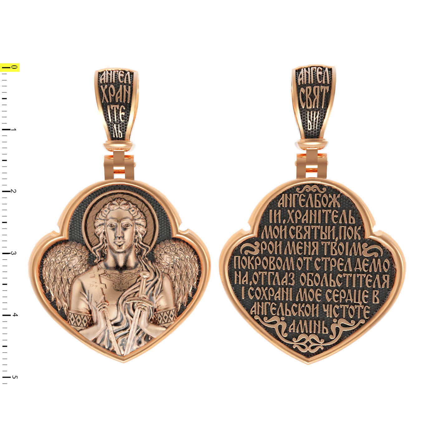На оборотной стороне образка написана молитва: «Ангеле Божий, Хранитель мой Святый, покрой меня твоим покровом от стрел демона, от глаз обольстителя и сохрани мое сердце в ангельской чистоте. Аминь».