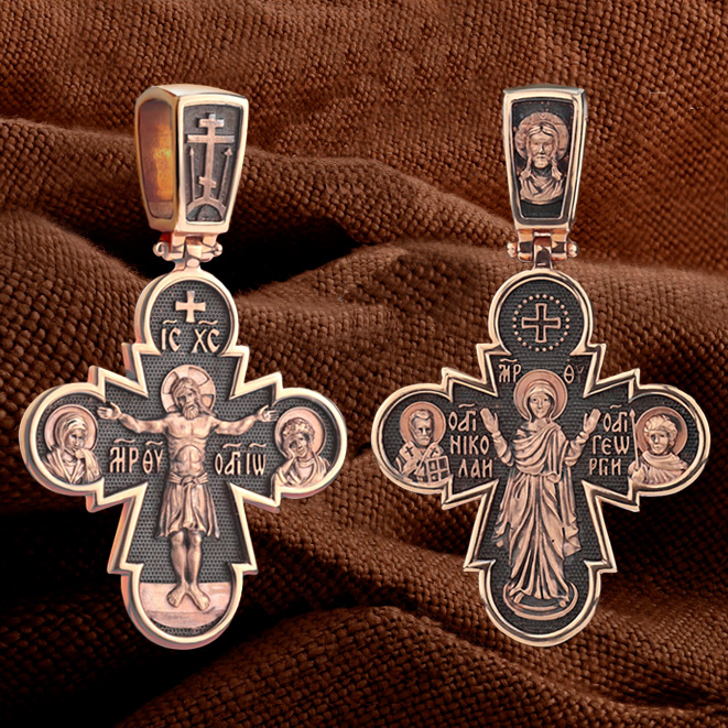 Центральную часть оборота креста занимает икона Божьей Матери «Нерушимая Стена». Особенно почитается эта икона как помощница в тяжелых жизненных ситуациях, как защитница от врагов и спасительница в смертельной опасности. Слева от Божьей Матери расположен образ Святого Николая Чудотворца. Ему молятся, отправляясь в путешествие, особенно по морю, просят исцеления в различных недугах, помощи в торговых делах, учебе и поисках достойного супруга. Справа — святой великомученик Георгий Победоносец († 303), один из наиболее почитаемых святых в Христианской Церкви. Покровитель воинов, помощник в крестьянском труде, защитник в бедах, духовный помощник в невидимой брани с силами зла. Святой Георгий, небесный защитник, который спускается с Небес, чтобы помочь душе избавиться от гибели.