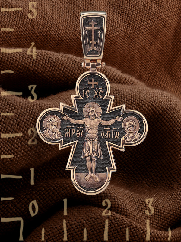На лицевой стороне этого креста Иисус Христос является как Господь, Творец мира и его Грозный Судия, царящий на Небесах. Православная иконография показывает нам распятого Господа не в виде мучительно умирающего человека, а как величественного и всесильного Бога, который простирает руки, словно обнимает весь мир. Человеческие страдания Господа обычно только обозначаются наклоном Его головы и полузакрытыми глазами. С двух сторон Христу предстоят Пресвятая Богородица и Святой апостол и Евангелист Иоанн Богослов.