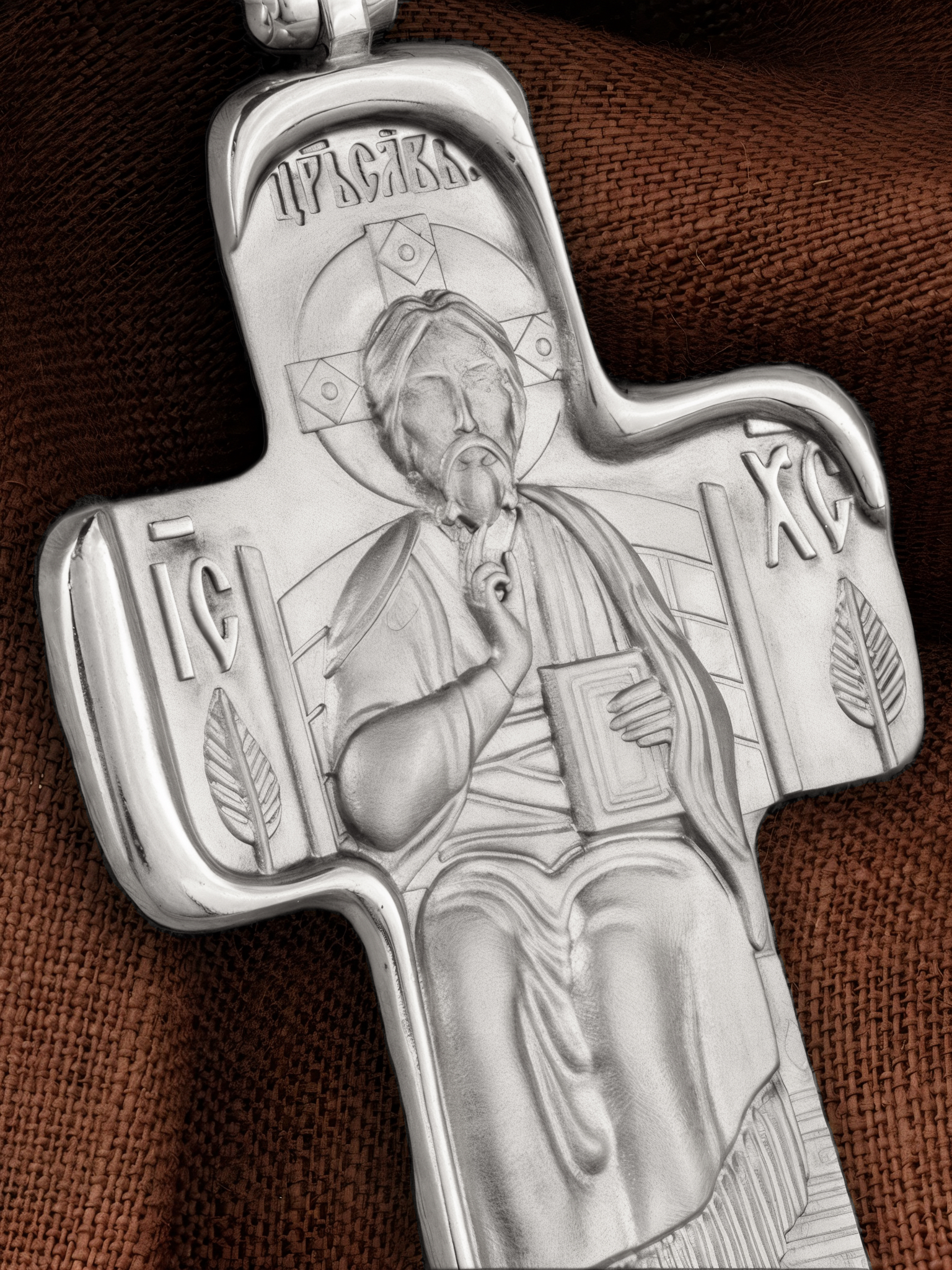 На лицевой стороне креста помещен образ Господа Иисуса Христа «Спас Вседержитель». Он изображен восседающим на престоле. Господь представлен как Царь Небесный и будущий Судия мира. Именование Иисуса «Вседержителем» указывает, с одной стороны, на Его Божественную природу: «Аз есмь Альфа и Омега, начало и конец, говорит Господь, Который есть и был и грядет, Вседержитель» (Откр. 1: 8). С другой стороны, такое именование связано и с человеческой природой Христа, искупившего крестной жертвой людские грехи и обновившего тем самым человеческую природу. В левой руке Он держит открытую Книгу, а правой рукой благословляет. Книга символизирует Евангелие — благую весть, принесенную Христом всему миру. Символизирует и Книгу Жизни, где записаны имена всех, возлюбивших Бога. Образ сопровождается каноническими надписями: «Царь Славы» и «IС ХС», что означает Иисус Христос.