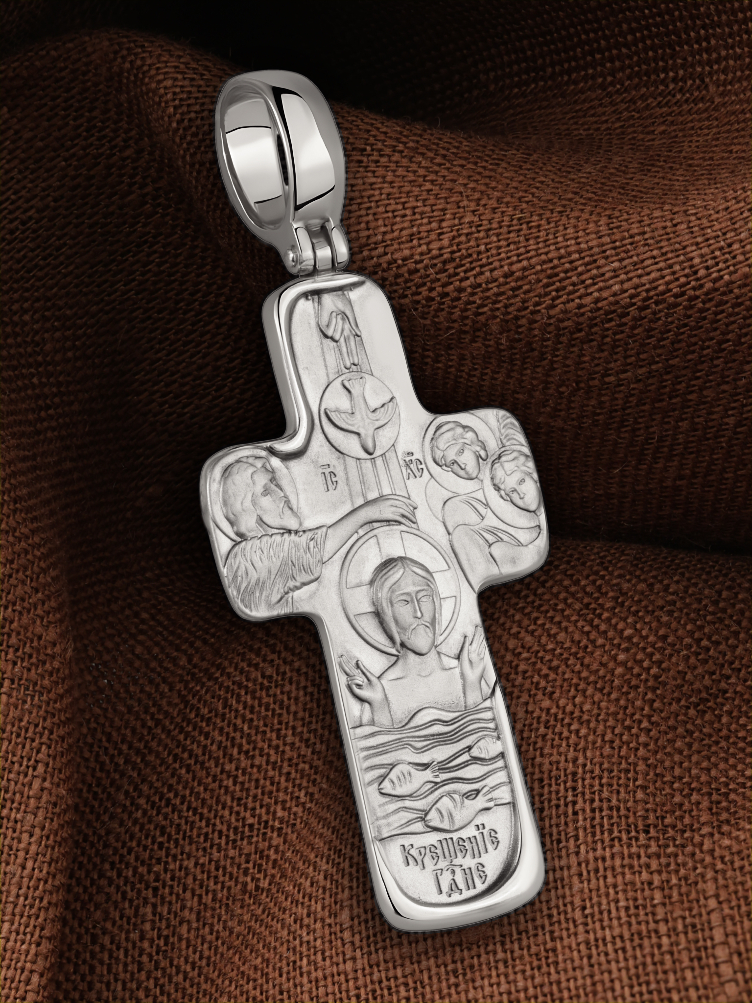На оборотной стороне креста изображено «Крещение Господне». В образе запечатлено не только Крещение Спасителя во Иордане от Иоанна Предтечи, но, прежде всего, явление миру воплотившегося Сына Божия как Одного из Лиц Святой Троицы, о Котором свидетельствуют благословляющий десницей Отец и Святой Дух, сошедший на Христа в виде голубя. Справа изображены ангелы, склонившиеся ко Христу и, подобно восприемникам от купели, держащие покровы на руках.