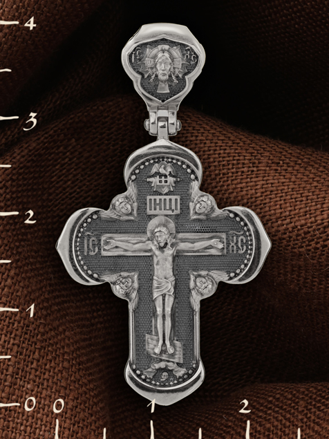 На лицевой стороне креста изображено Распятие Господа и Спасителя нашего Иисуса Христа, отдавшего Себя на смерть, для искупления грехов мира. Крест является символом жертвенной любви Всеблагого Бога к падшим людям, всепобеждающим духовным оружием христиан, основанием и средоточием церковной жизни. Господь сказал: «кто хочет идти за Мною, отвергнись себя, и возьми крест свой, и следуй за Мною». (Мк. 8: 34). На верхней табличке, выше головы Иисуса, расположена надпись, составленная Понтием Пилатом — «IНЦI». Она означает «Иисус Назорей, Царь Иудейский». Надпись «IC» «ХC», означает Иисус Христос, помещается на разных сторонах поперечной перекладины креста. Крест стоит на горе камней, символизирующих Голгофу. В ее основании различается череп– это голова Адама. На кулонном кольце изображен Нерукотворный образ Господа и Спасителя нашего Иисуса Христа, чудесно отпечатавшийся на плате, которым Христос вытер свой лик.